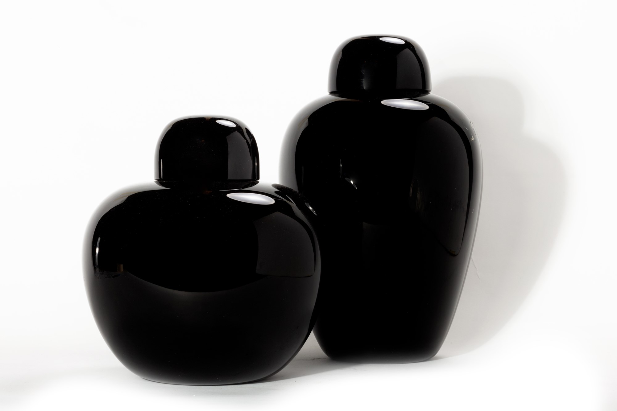 Due vasi in vetro nero con coperchio, Carlo Scarpa per Venini