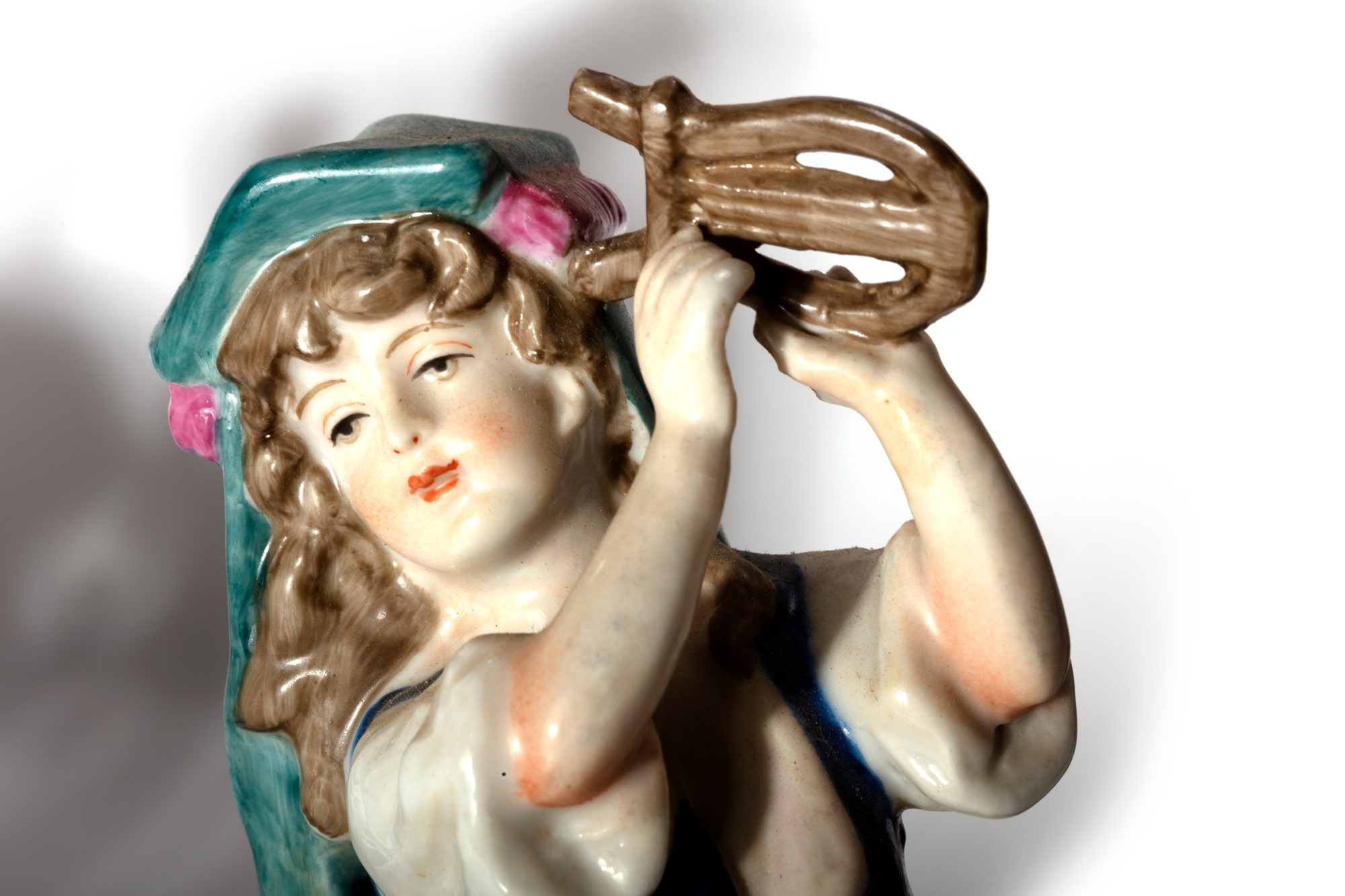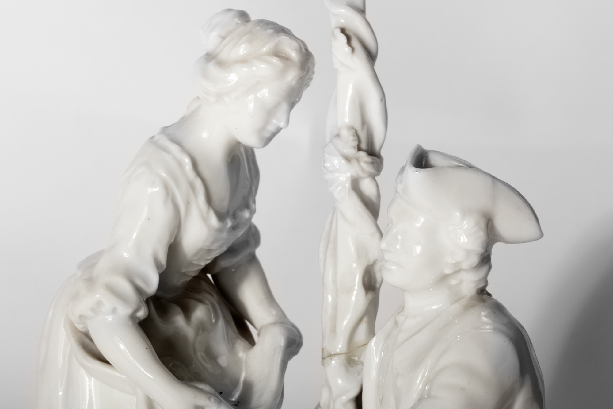 un suonatore di tamburello, una suonatrice di cetra, un bambino e una coppia galante in porcellana biancaun suonatore di tamburello, una suonatrice di cetra, un bambino e una coppia galante in porcellana bianca