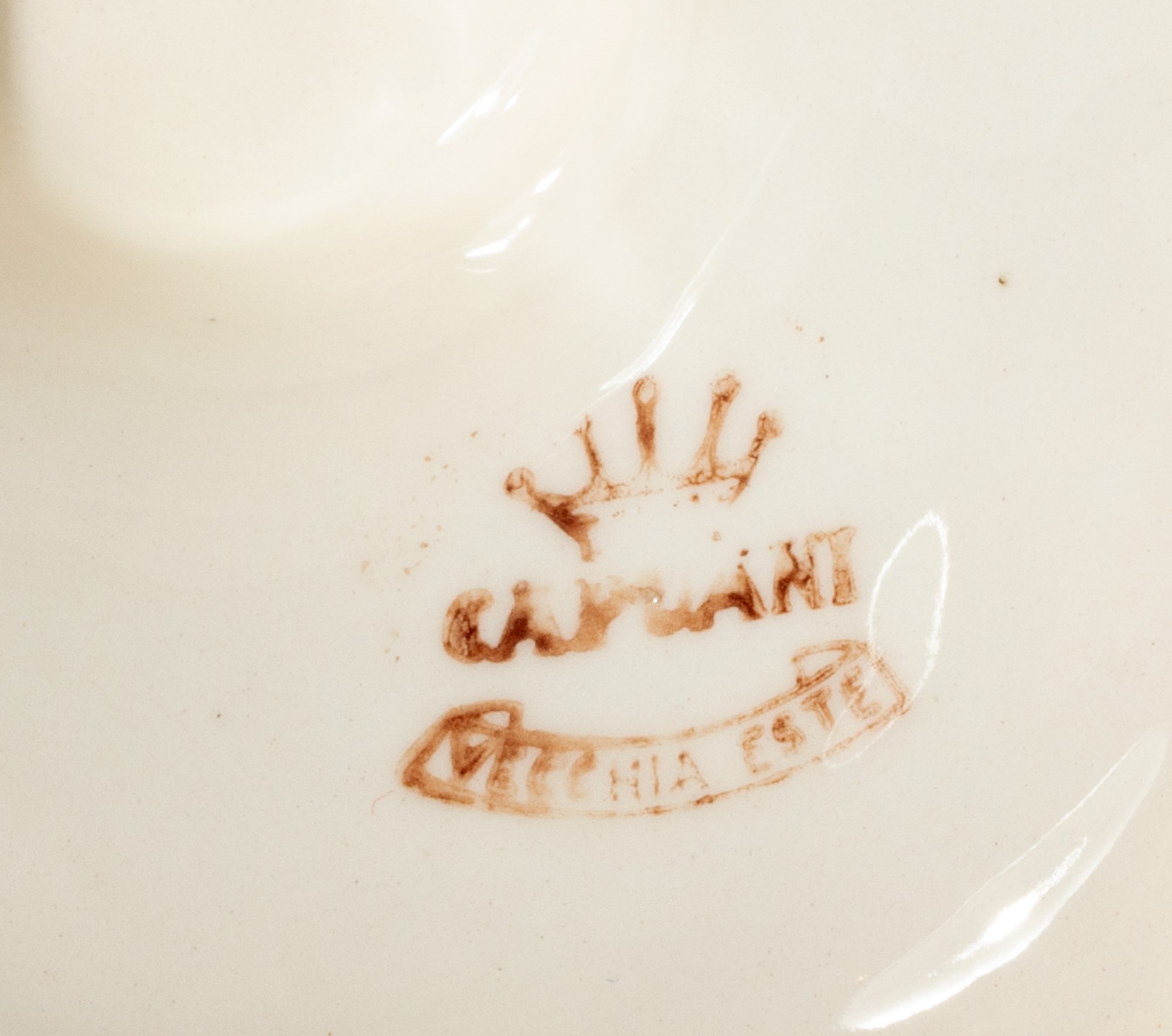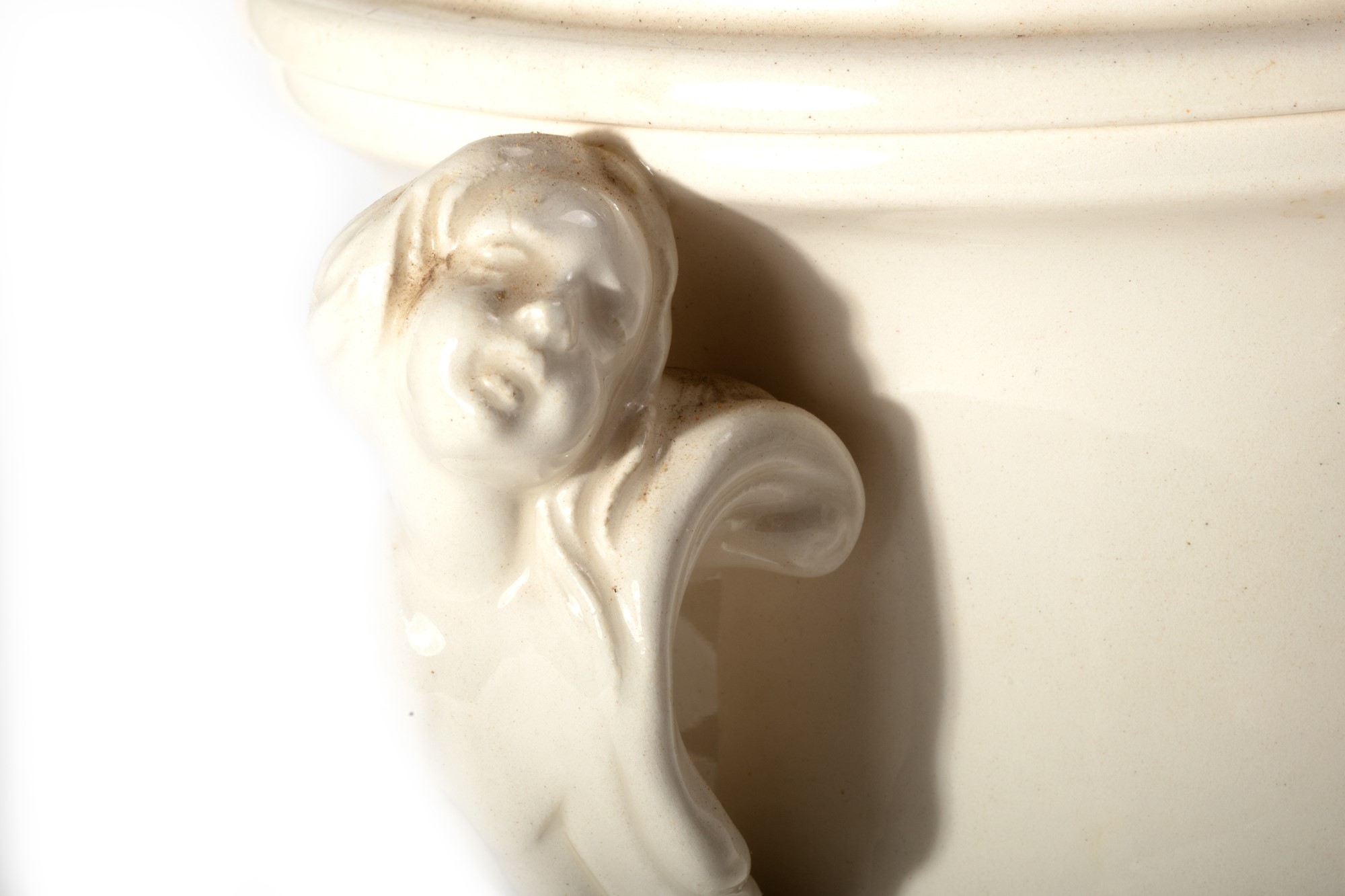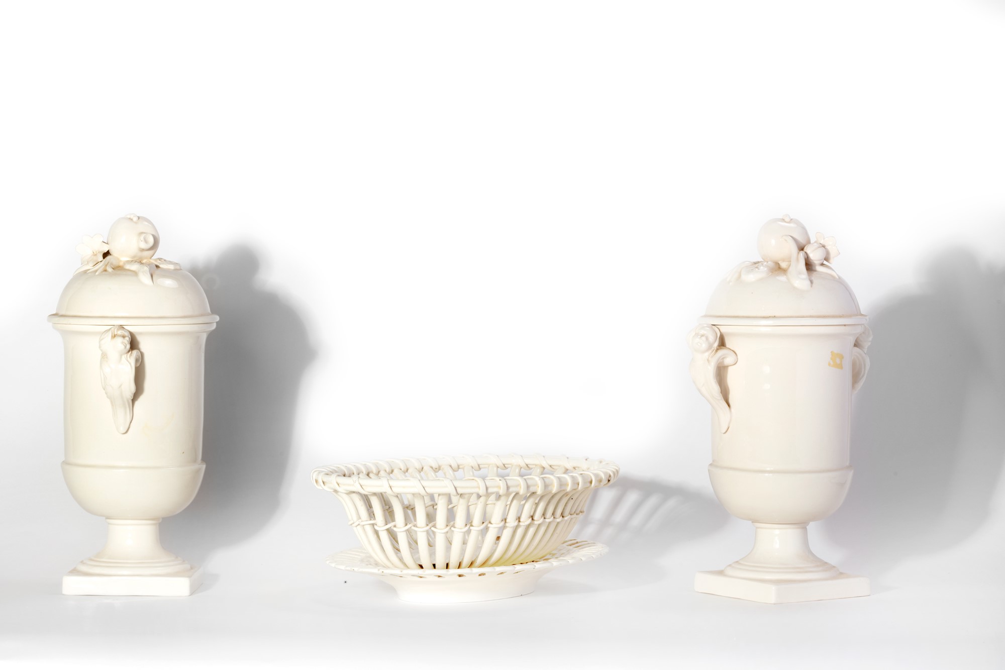 Lotto composto da una coppia di vasi biansati con testine di putti e un cestino con vassoio in ceramica bianca, secolo XX