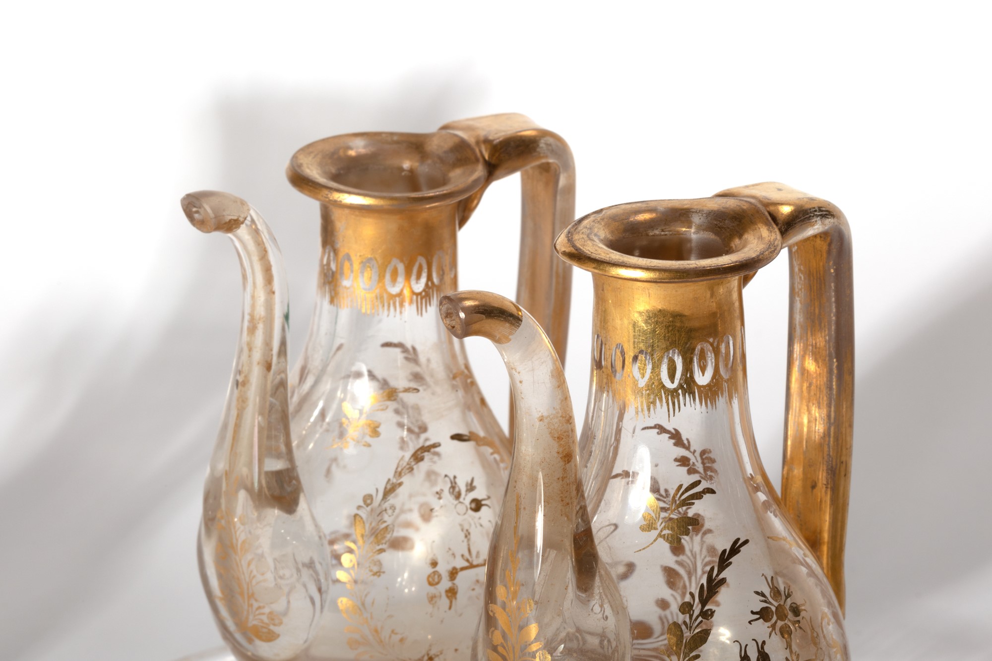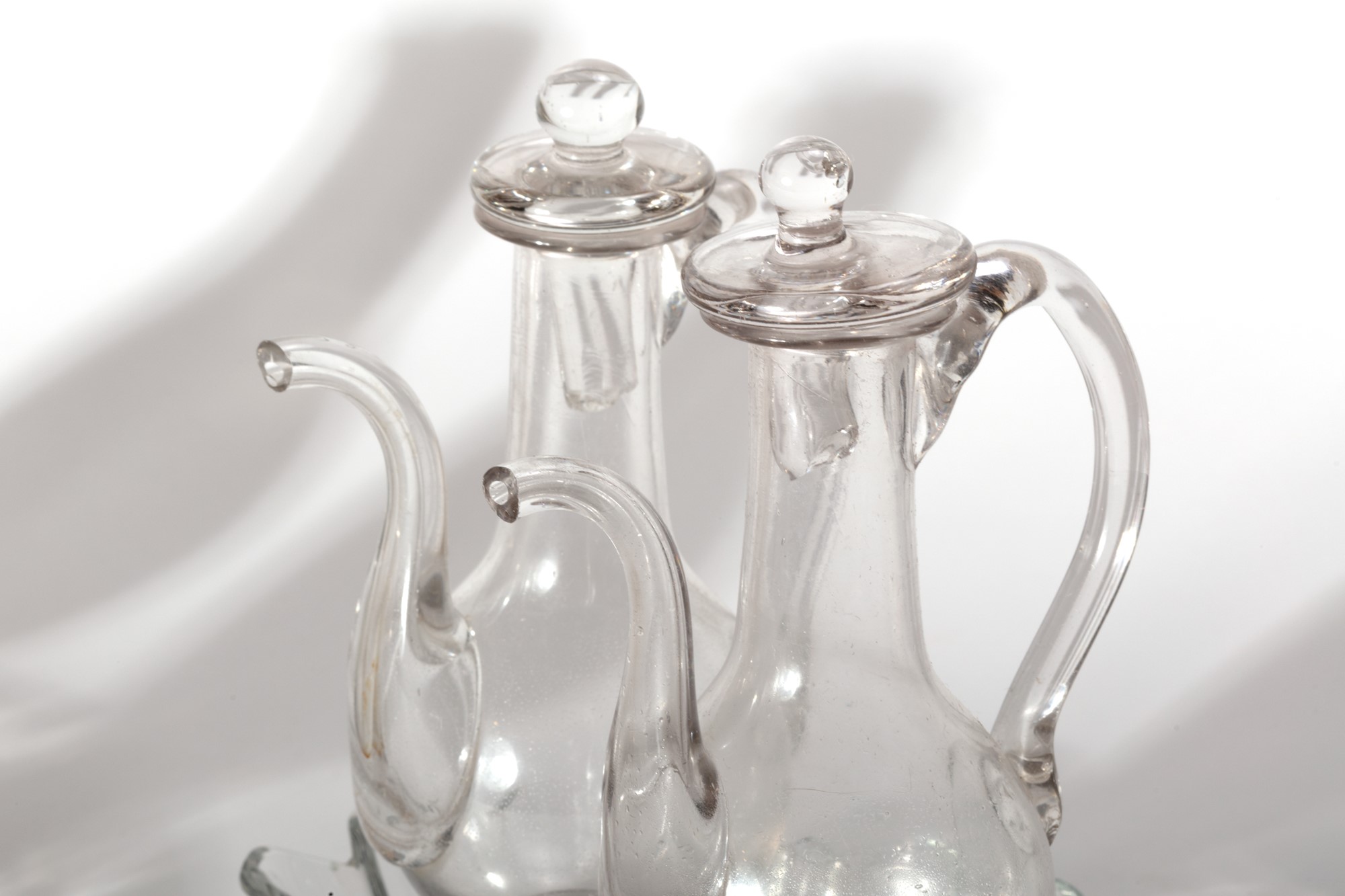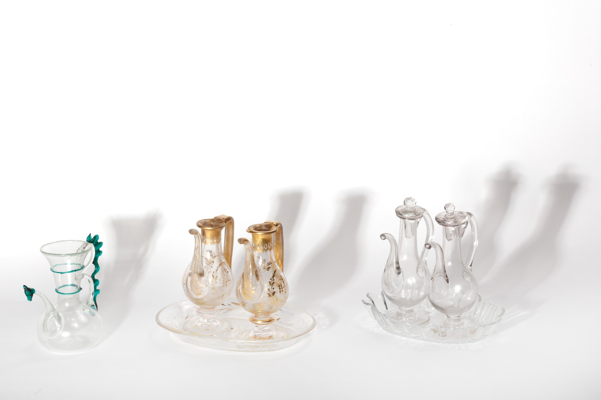 Lotto di cinque ampolle in vetro, due coppie con vassoio, secolo XIX