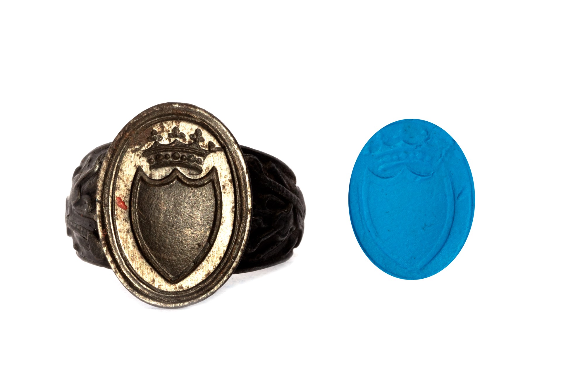 Lotto 542 | Anello in ferro, con scudo sormontato da corona, e strumenti musicali sui lati, secolo XIX