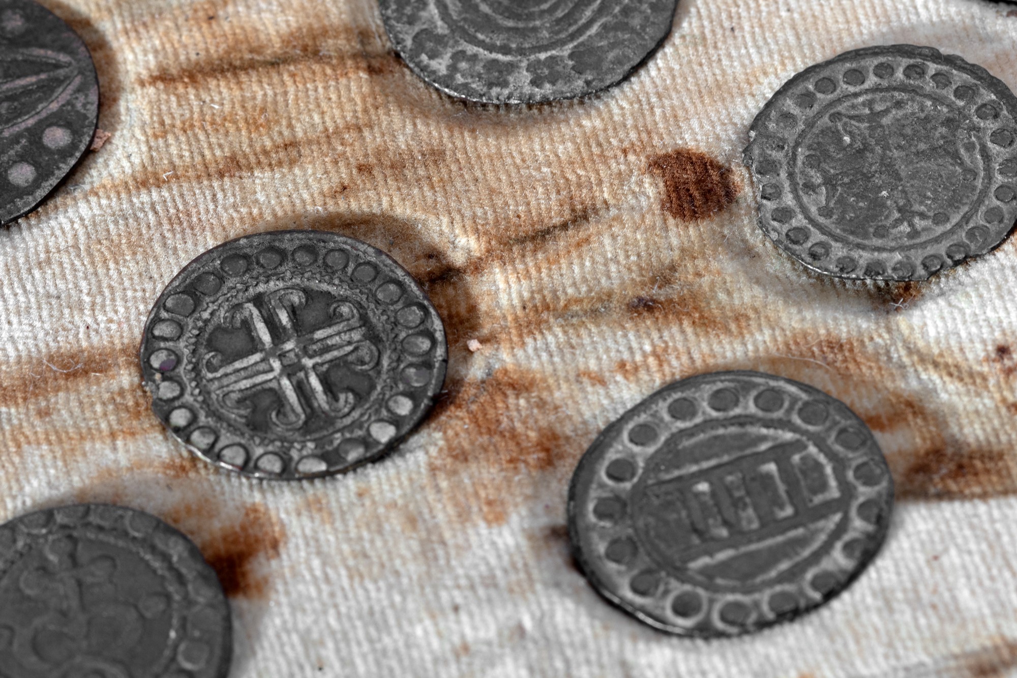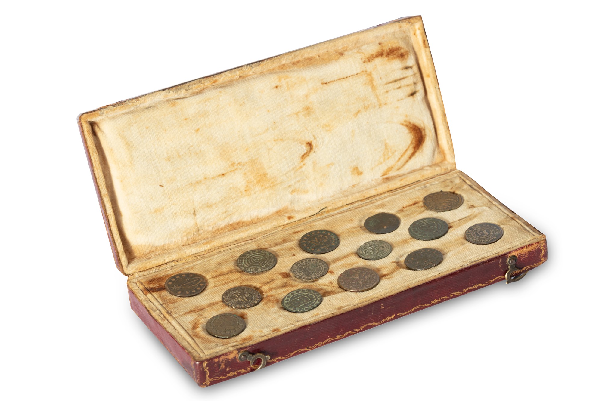 Lotto composto da 14 antiche monete in bronzo, entro astuccio in marocchino rosso