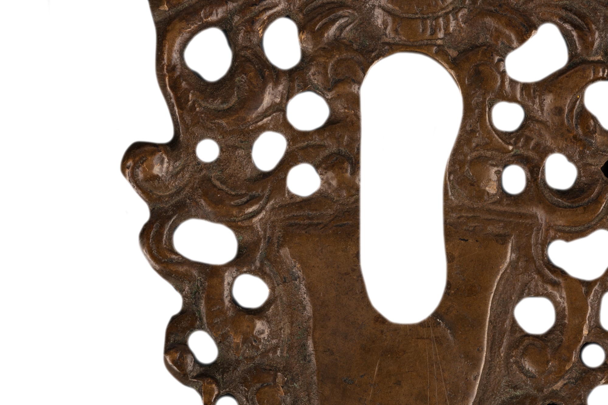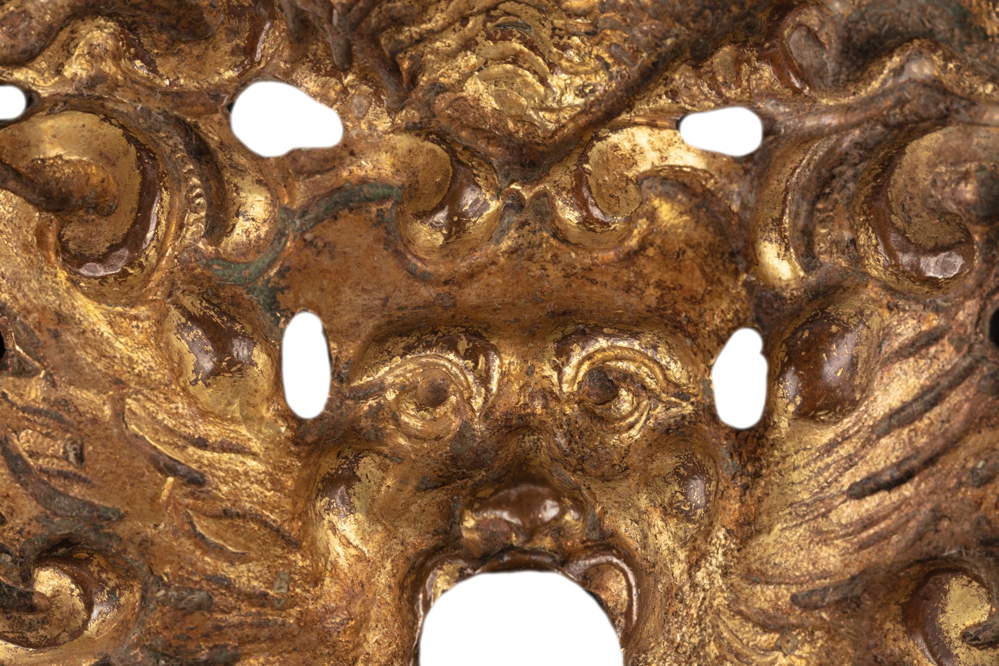 Lotto composto da quattro bocchette di serratura in bronzo, due dorate a forma di mascheroni, secoli XVII - XVIII