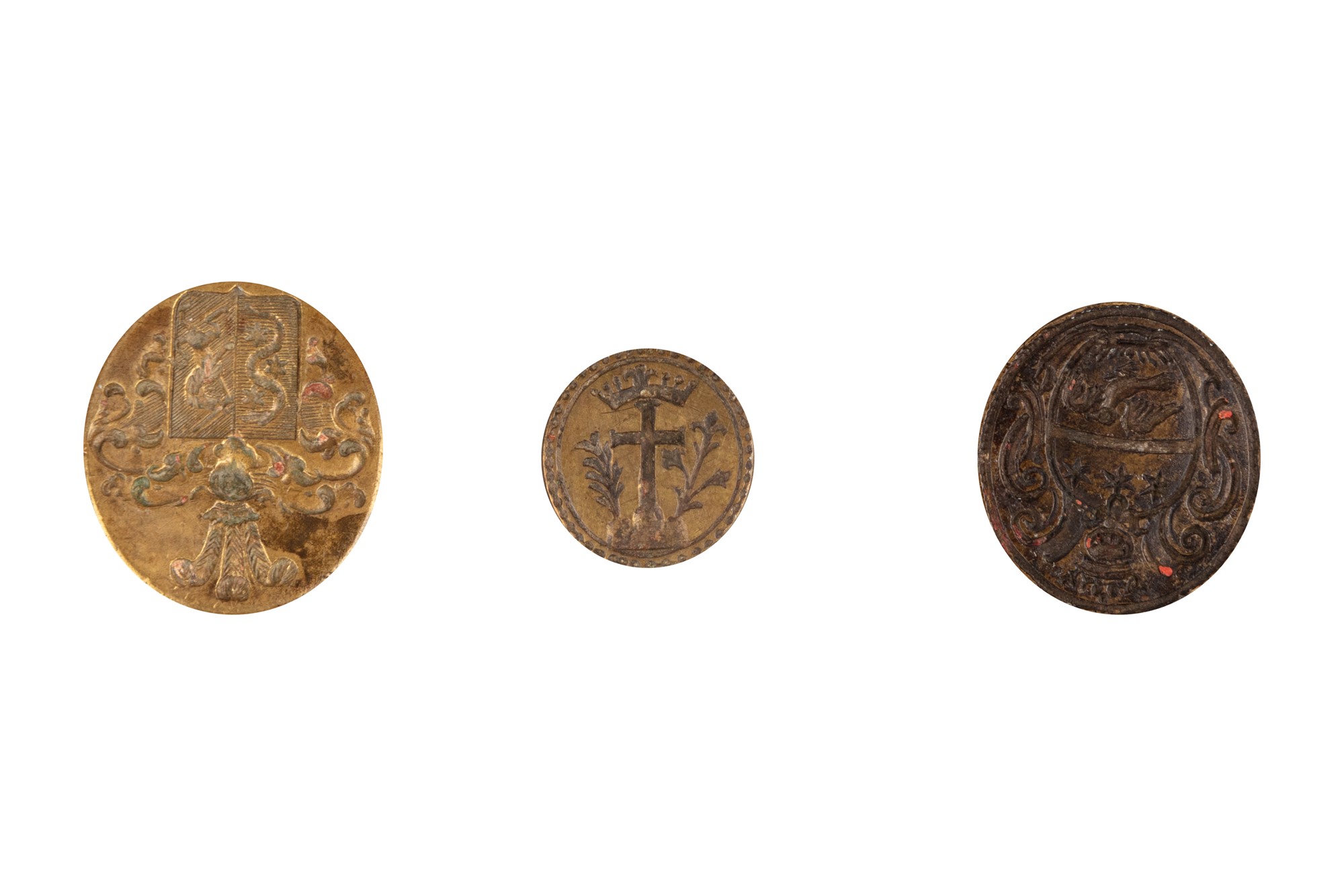 Lotto composto da tre sigilli di cui due in bronzo con manico in legno e uno con manico in corno, con stemmi nobiliari, secoli XVIII - XIX