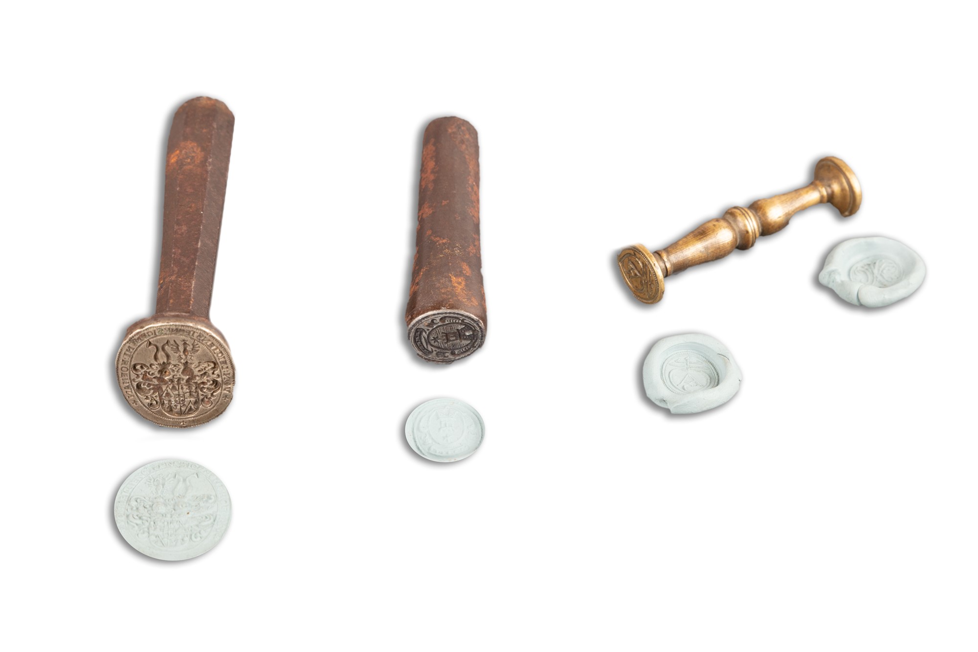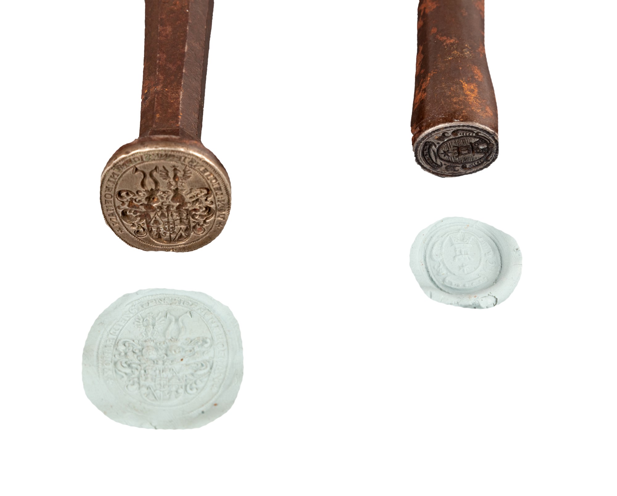 Lotto composto da tre sigilli, di cui due in ferro e uno doppio in bronzo, con stemmi nobiliari, secoli XVII - XVIII