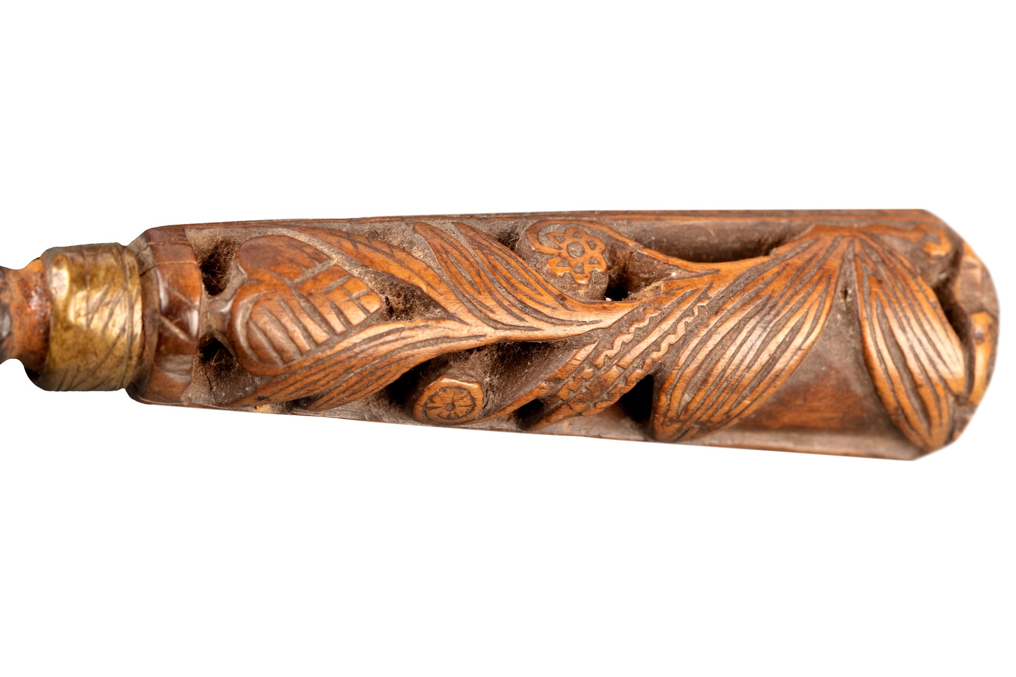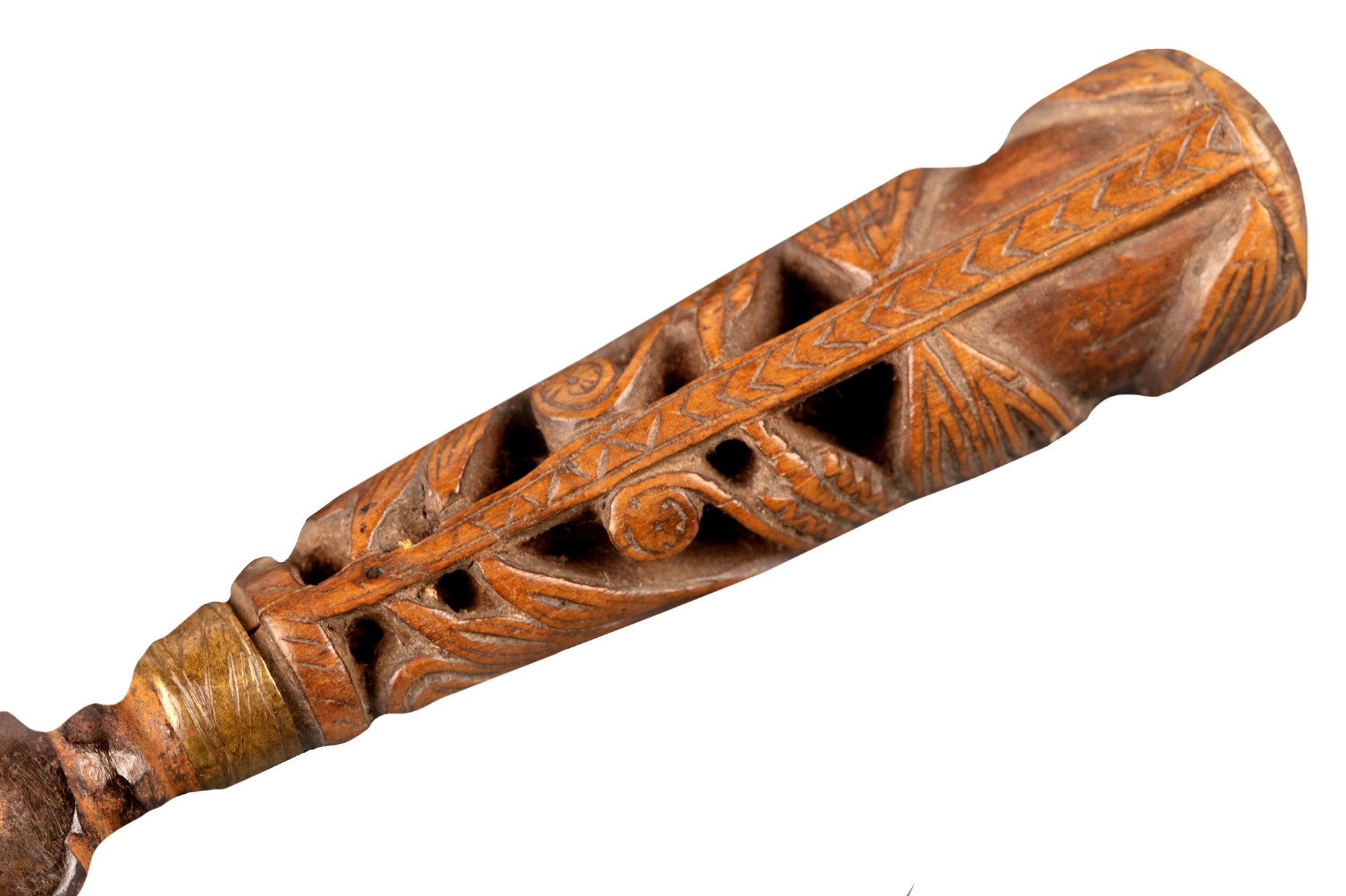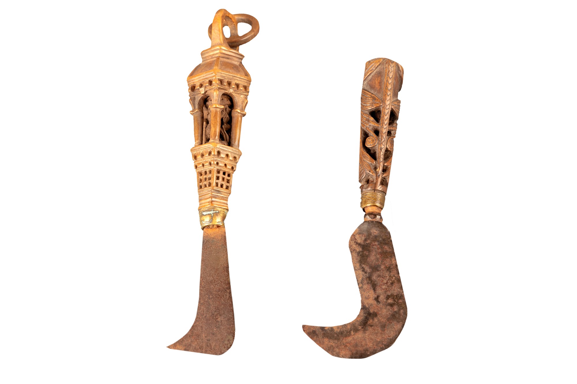 Lotto di due antiche roncole con manico in bosso finemente intagliato
