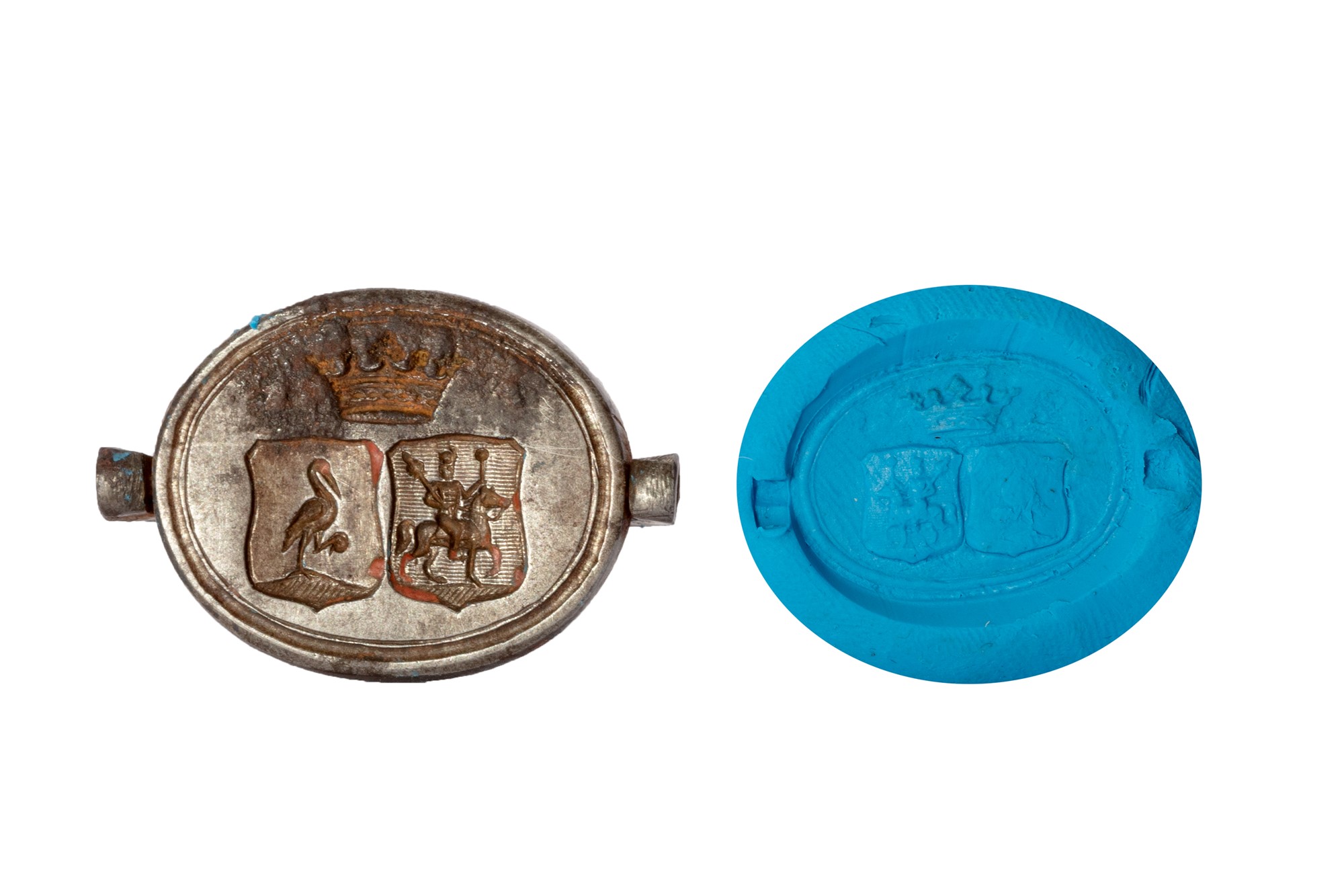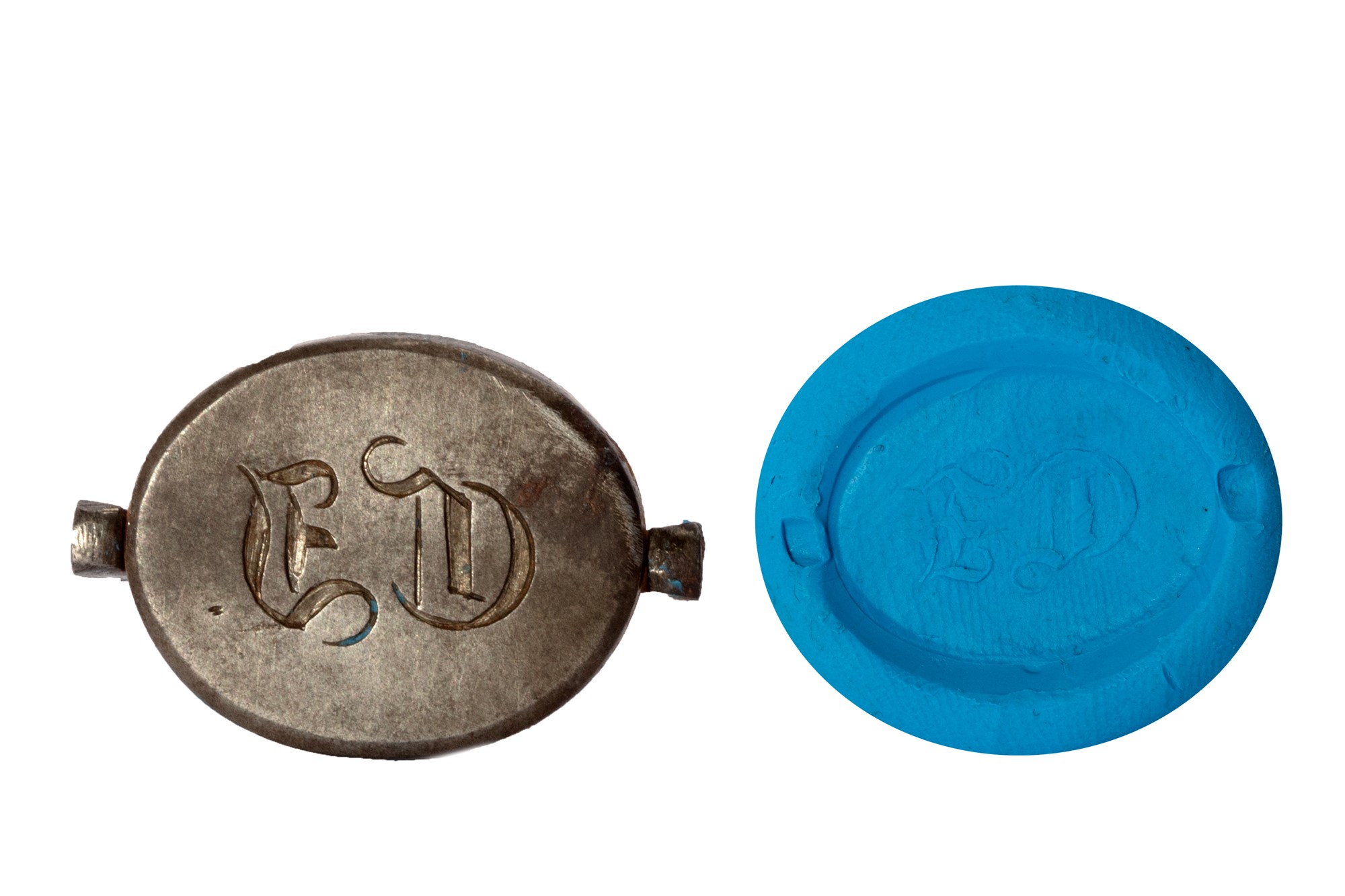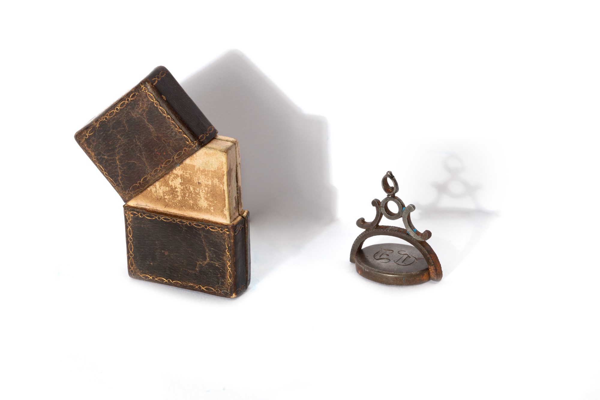 Sigillo a pendente in ferro con stemma nobiliare al recto e monogramma ED al verso, entro astuccio originale in cuoio, fine secolo XVIII