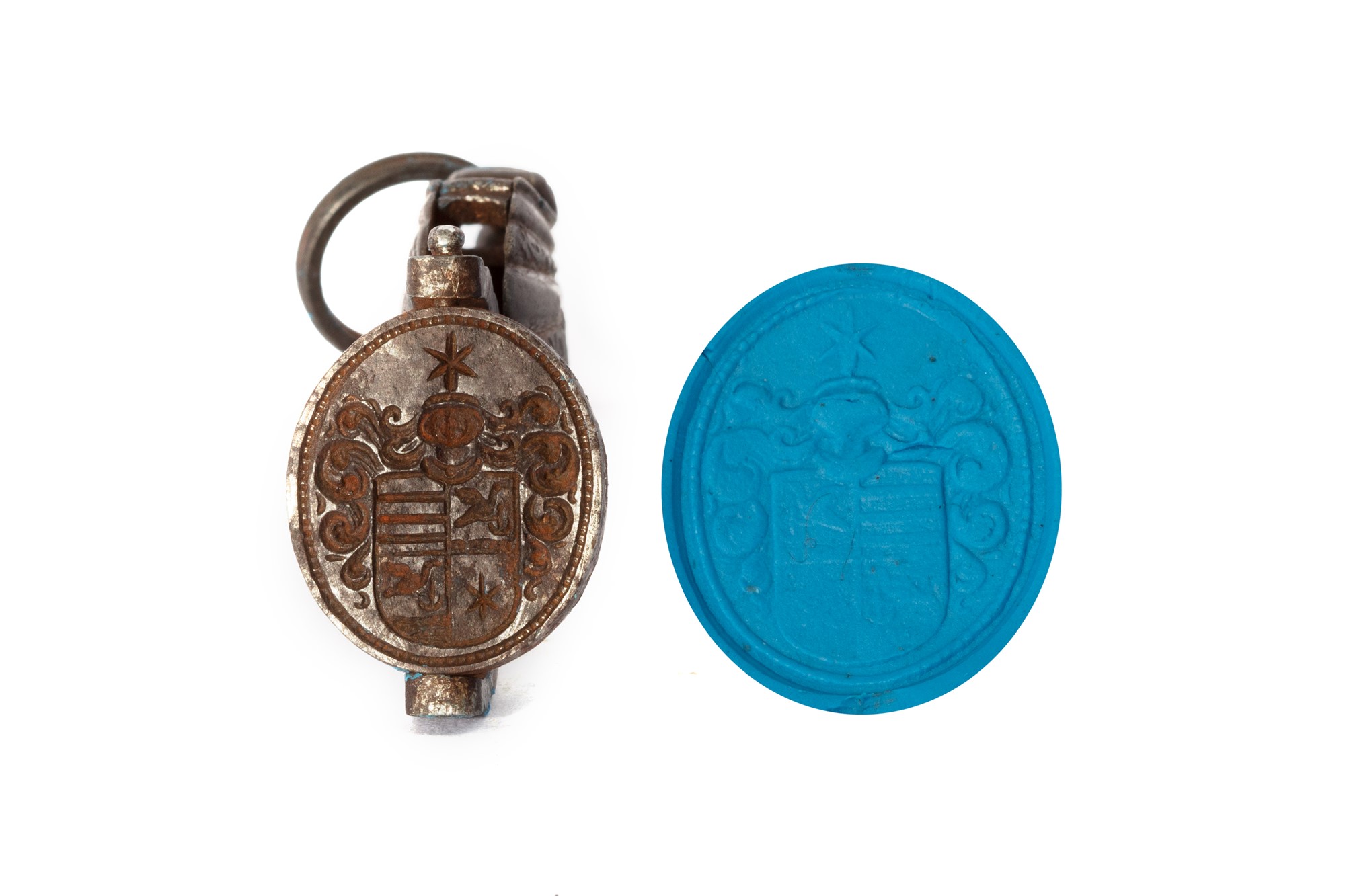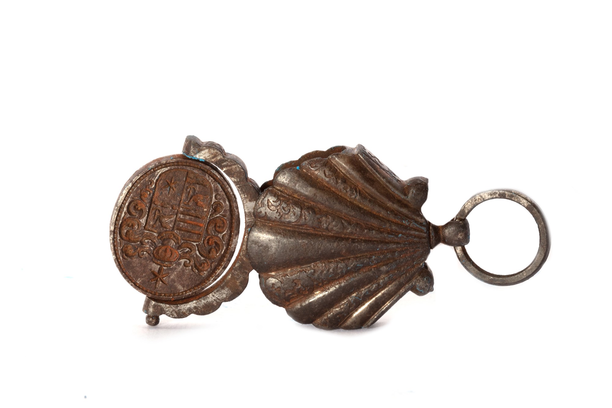 Sigillo a pendente in ferro, con custodia a scomparsa a forma di conchiglia e stemma nobiliare, secolo XVIII