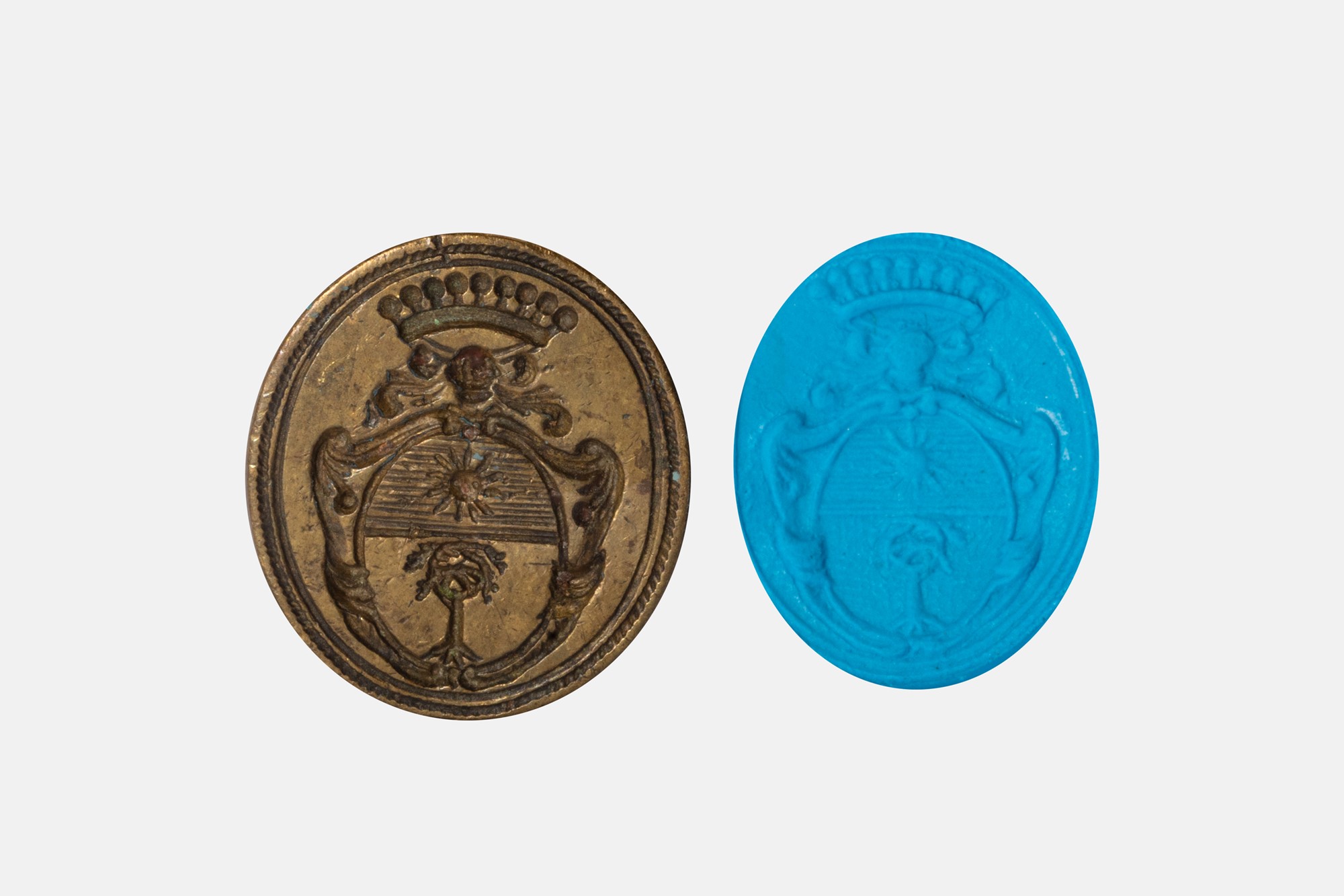 Lotto 659 | Sigillo in bronzo con manico in legno tornito, con stemma nobiliare, secoli XVII - XVIII