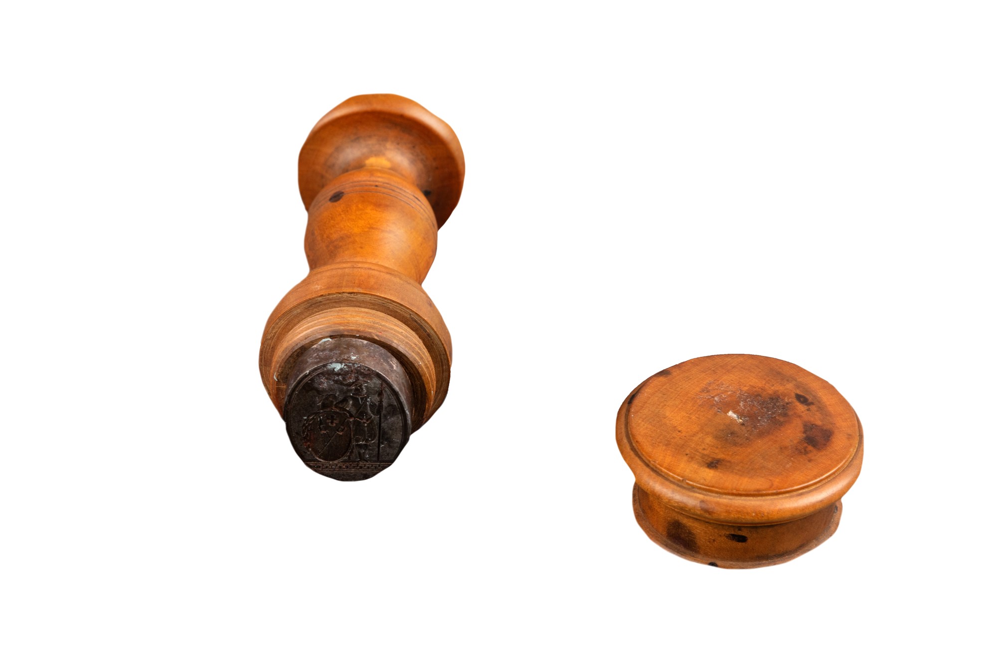 Sigillo in ferro, con custodia in legno tornito, raffigurante soldato appoggiato a uno stemma nobiliare, secoli XVII - XVIII