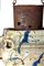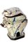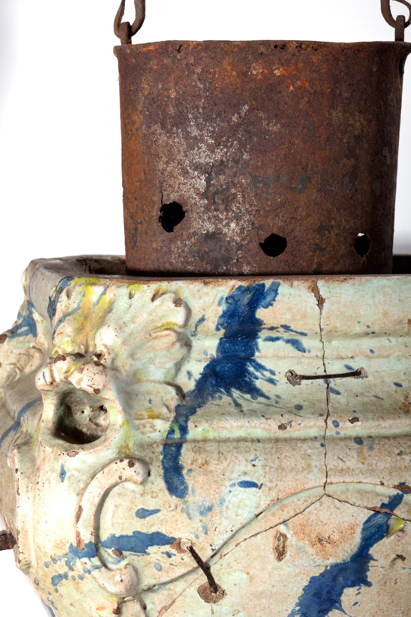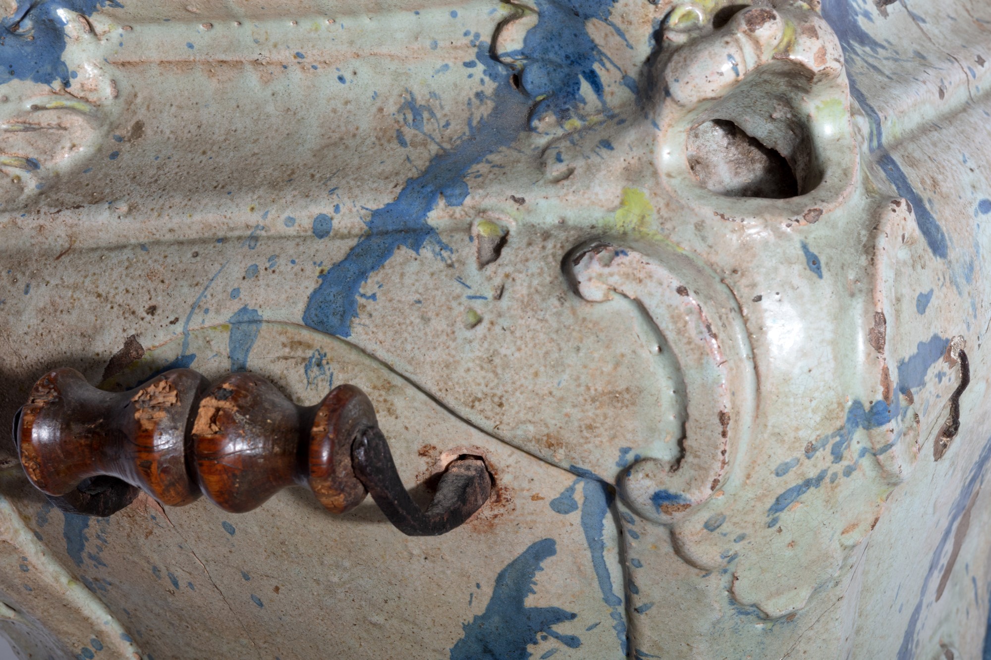 Antica stufetta in ceramica dipinta bianca e blu a finto marmo, con mascheroni agli angoli
