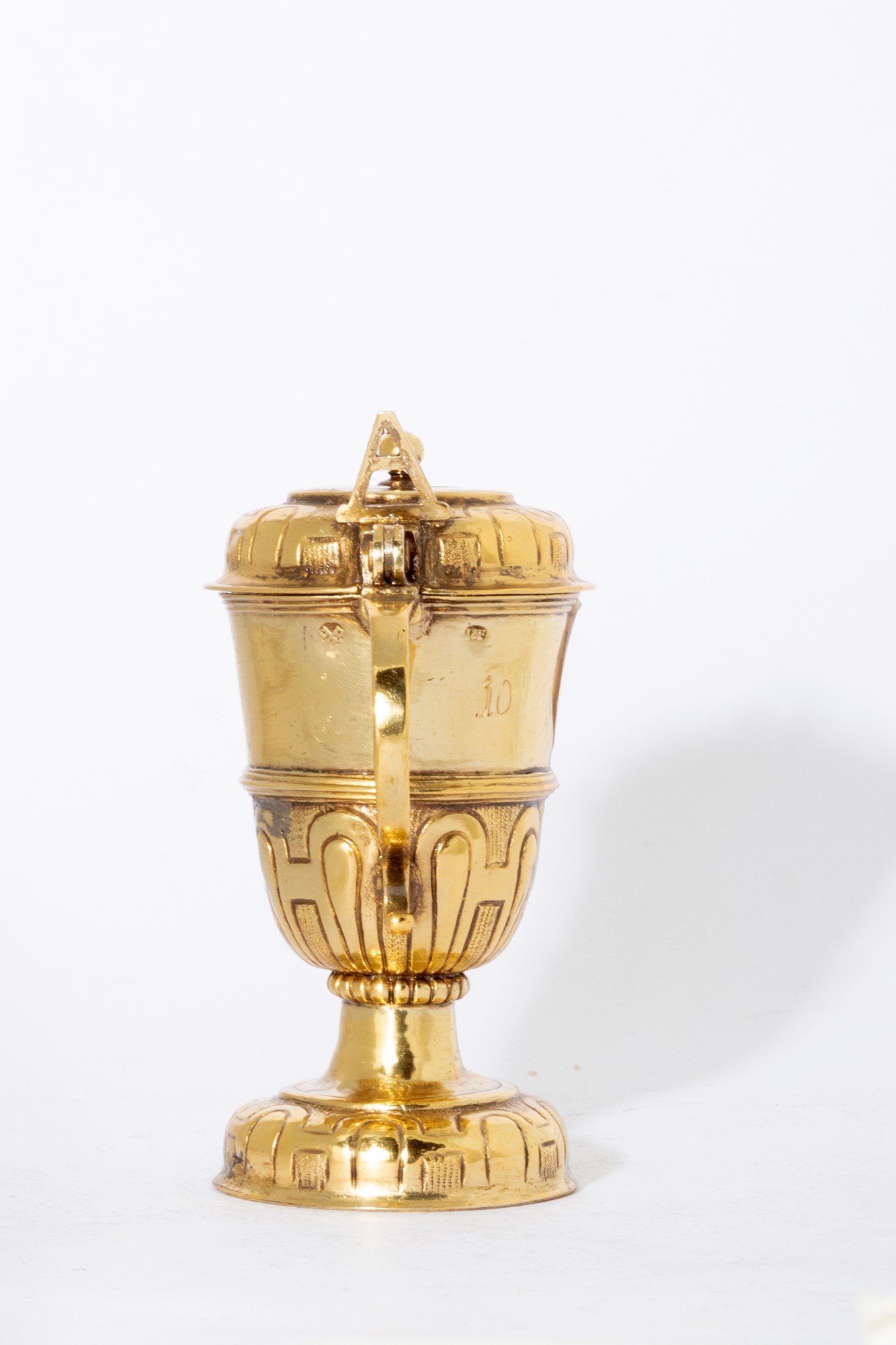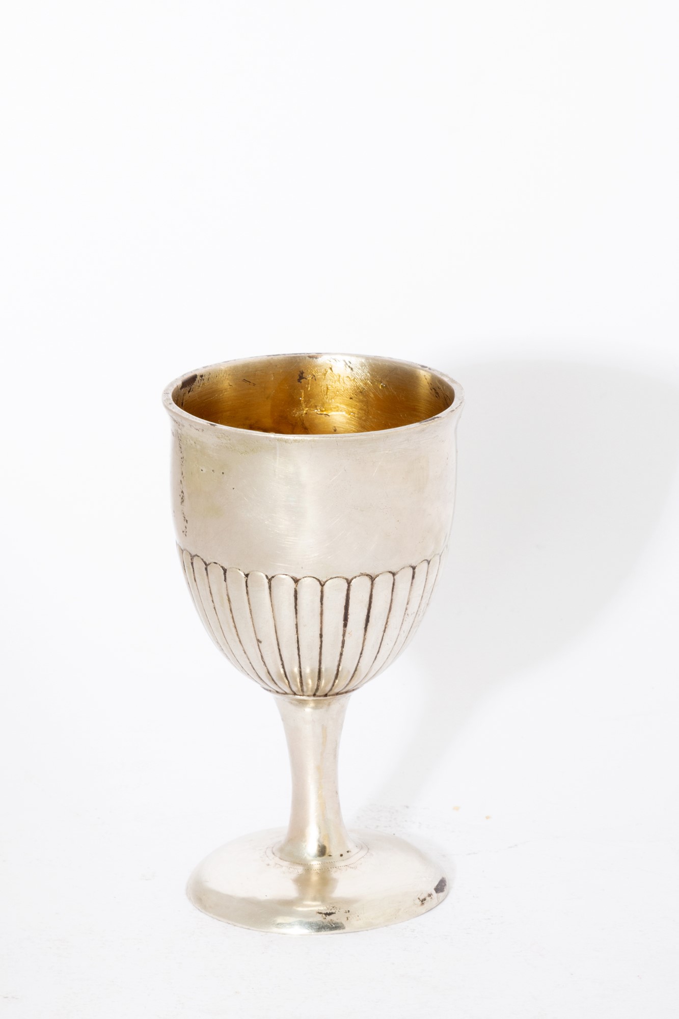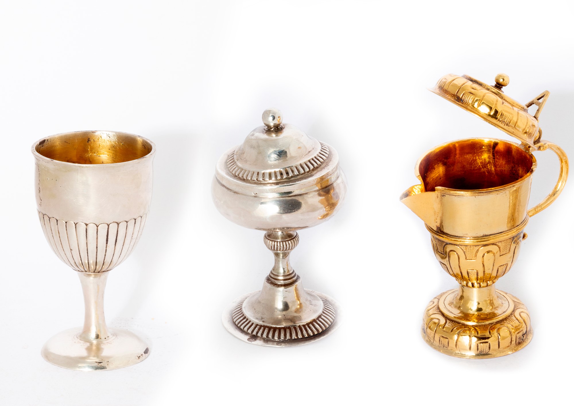 Lotto composto da un piccolo versatoio in argento dorato, un vasetto con coperchio in argento e un bicchierino a calice in argento