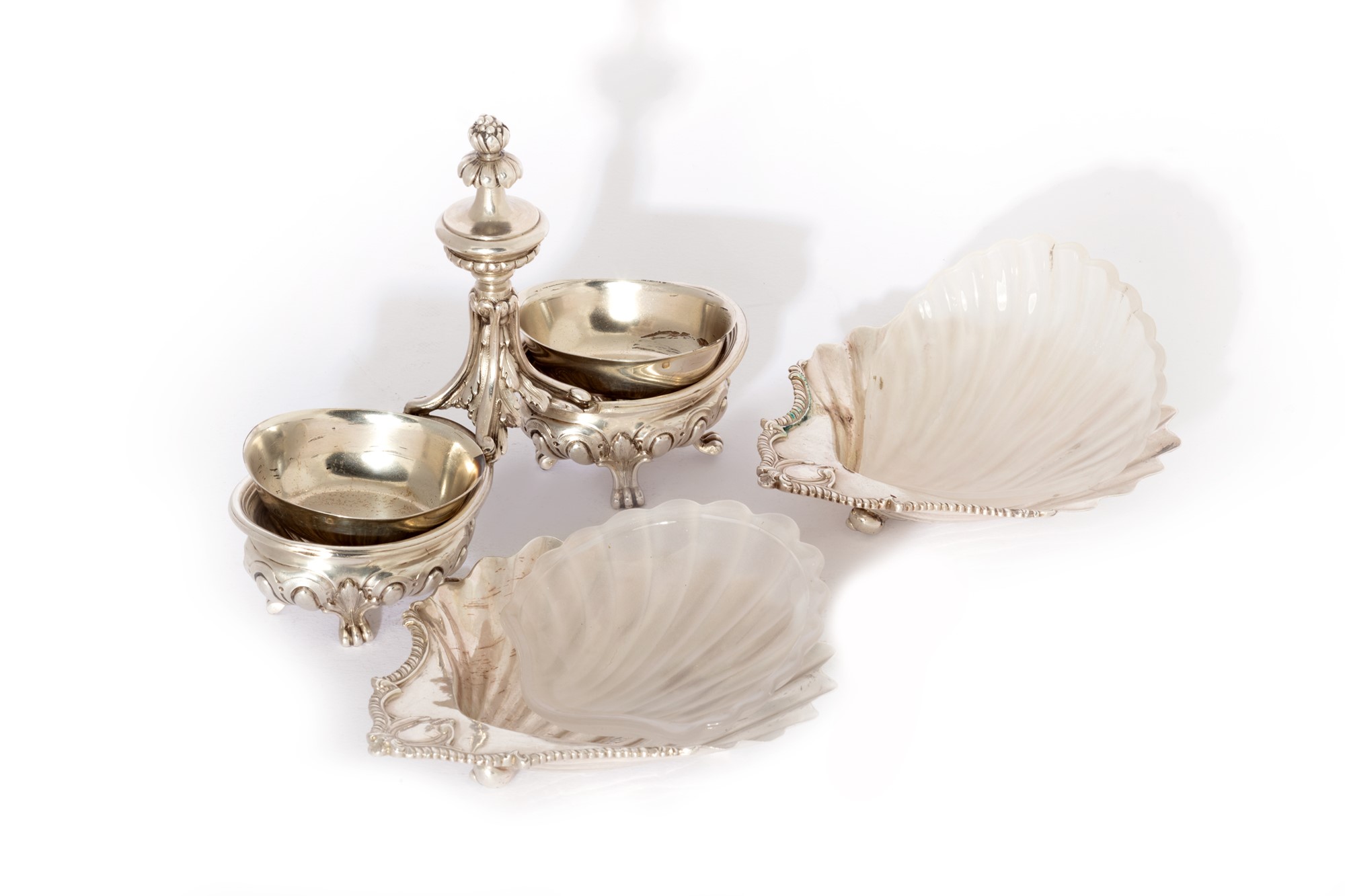 Lotto composto da una doppia saliera in argento e una coppia di salsiere a forma di conchiglie in argento e vetro