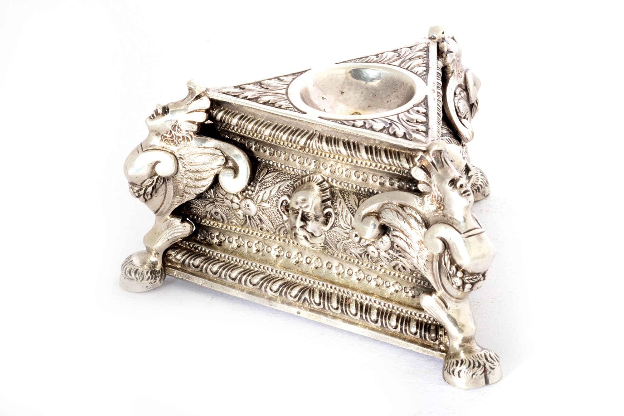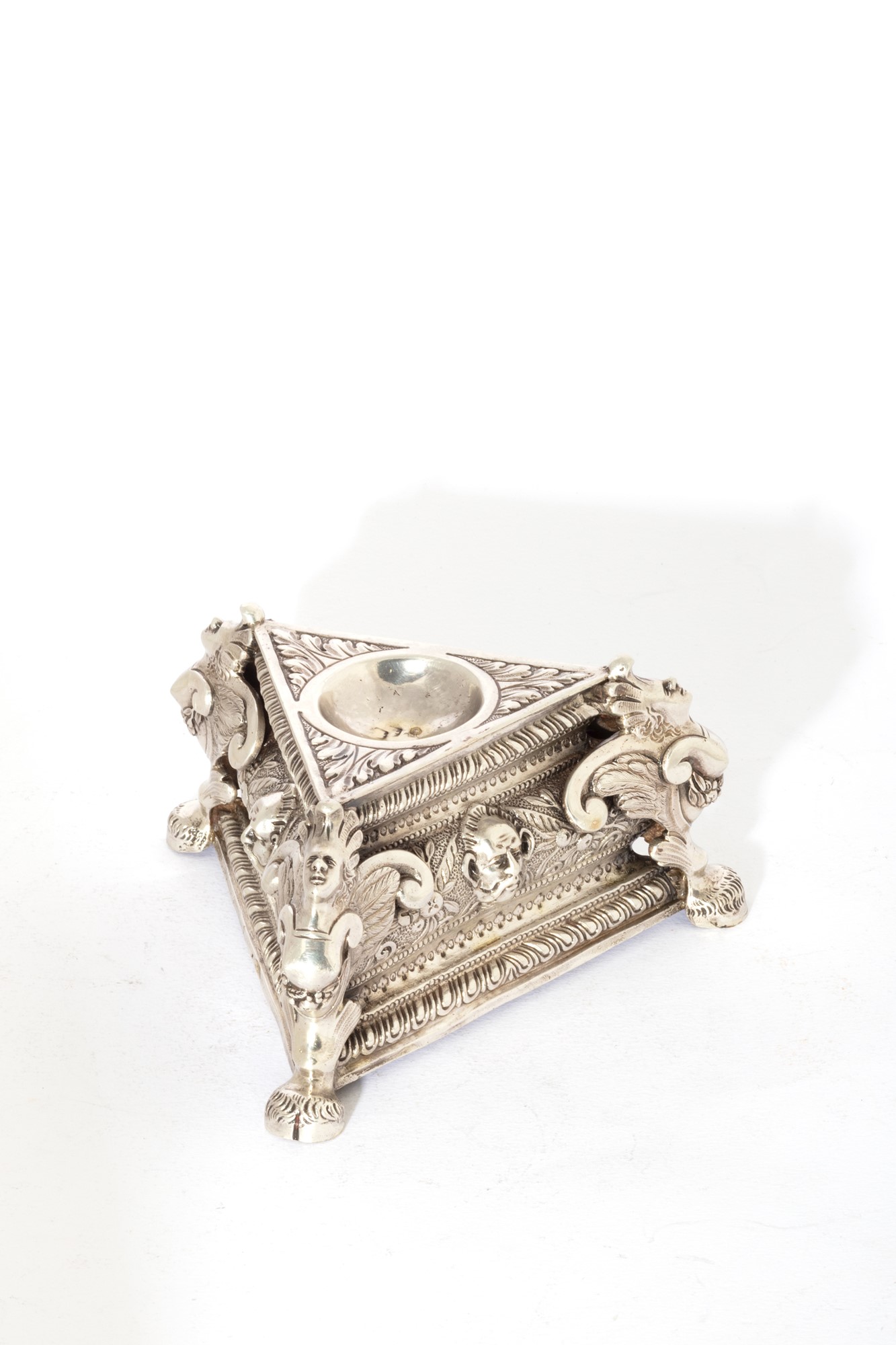 Saliera triangolare in argento in stile neorinascimentale, con arpie agli angoli,