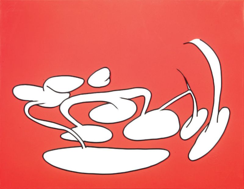 John Chilver Londra 1964 The week, 2001 Olio e silicone su tela, cm. 127x162,5 Firma, data, titolo e dedica al verso sul risvolto della tela: John Chilver 2001 "The week" for [...] / for better or for worse; sul telaio: etichetta e timbro Galleria il Capricorno, Venezia. Foto autenticata dall'artista, in data 24/5/01.