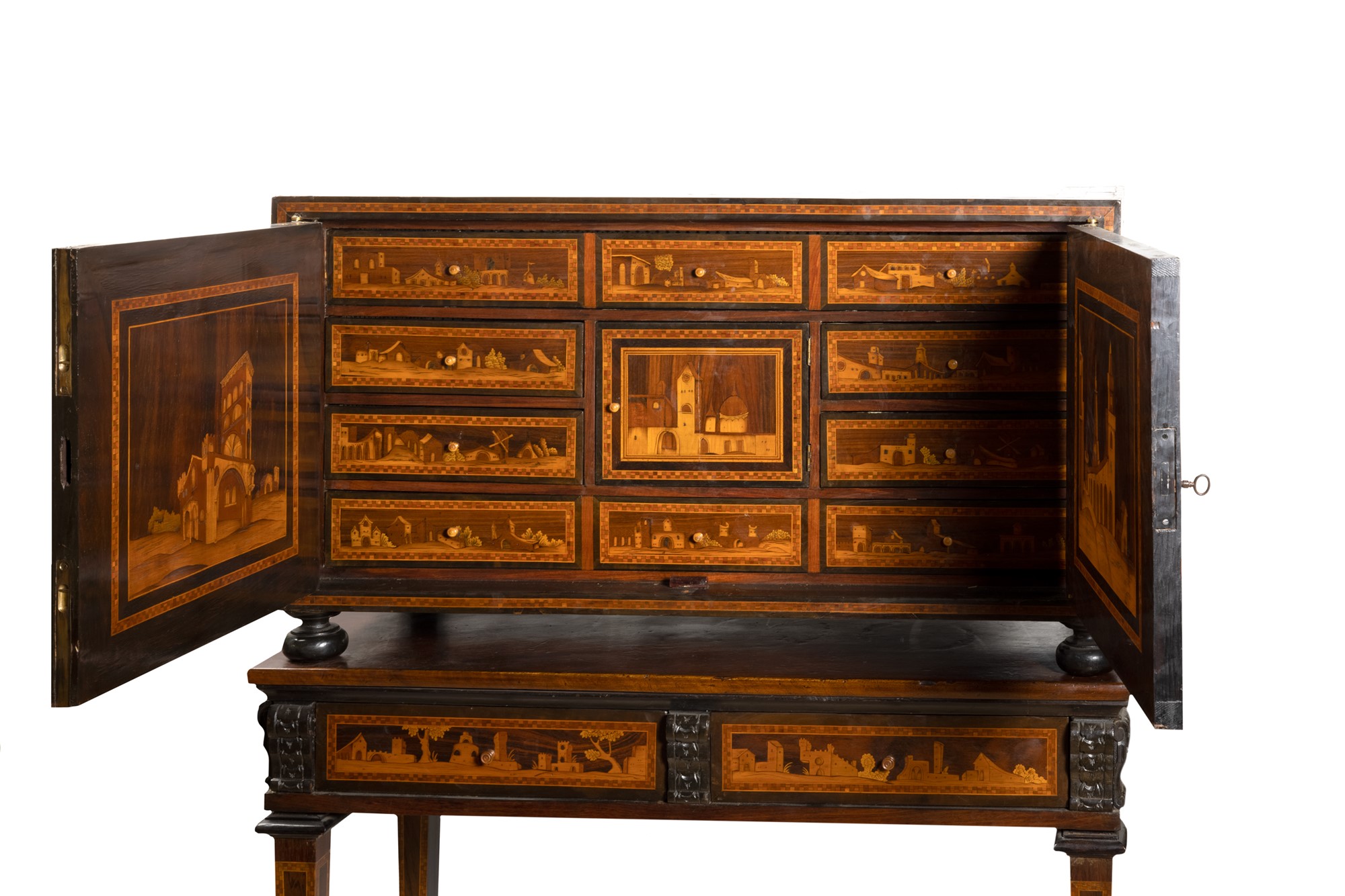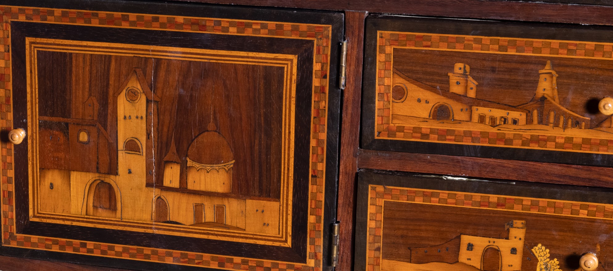 Stipo monetiere in legno finemente intarsiato con paesaggi e architetture, Italia centrale secolo XVIII
