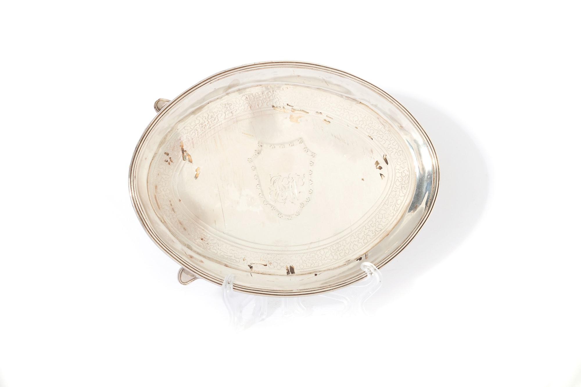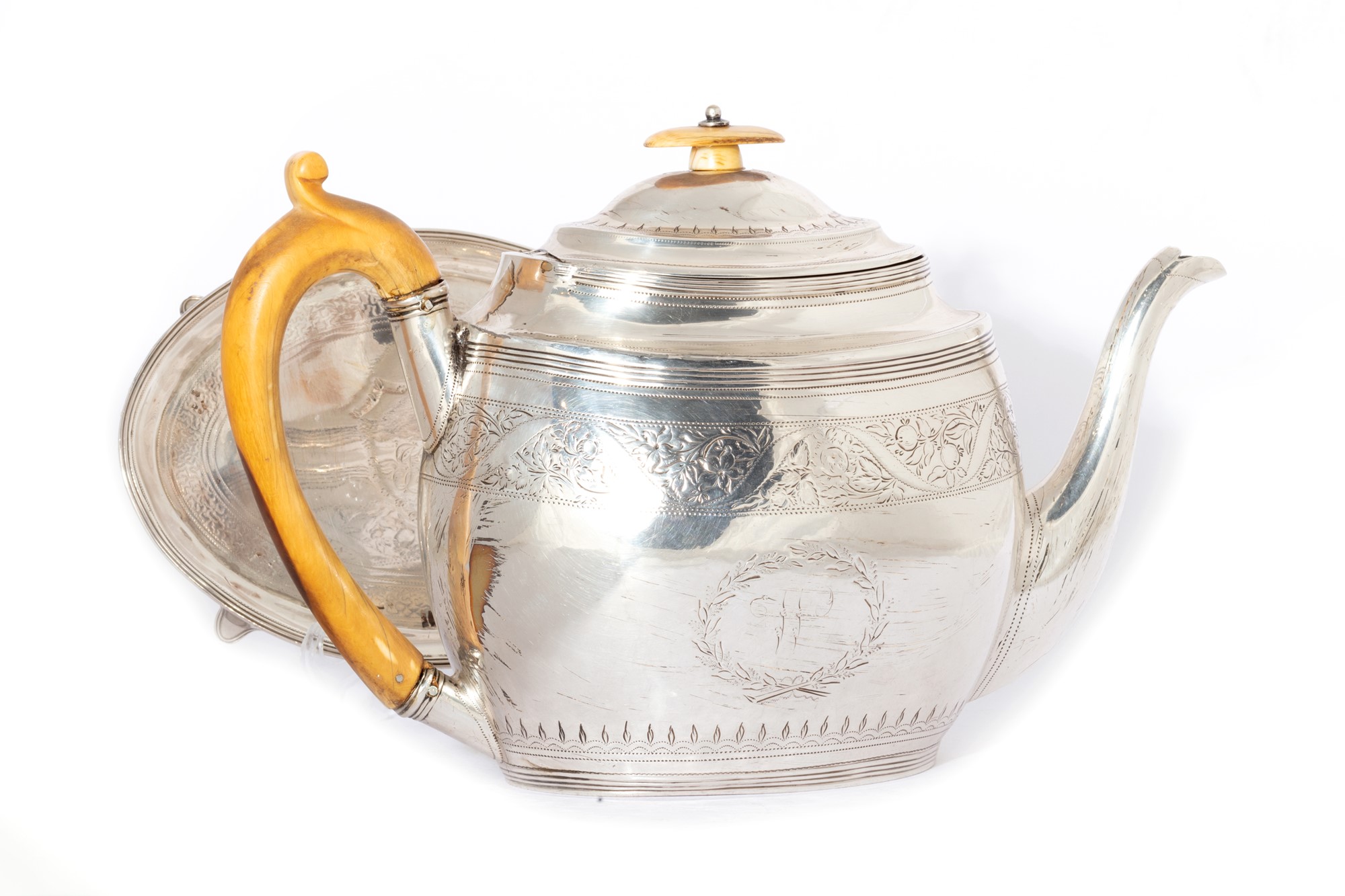 Teiera in argento con manico e presa in osso, e piccolo vassoio ovale, Inghilterra secolo XIX