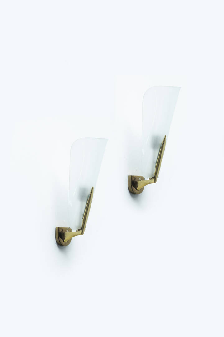 Coppia di appliques in ottone, diffusori in vetro satinato.