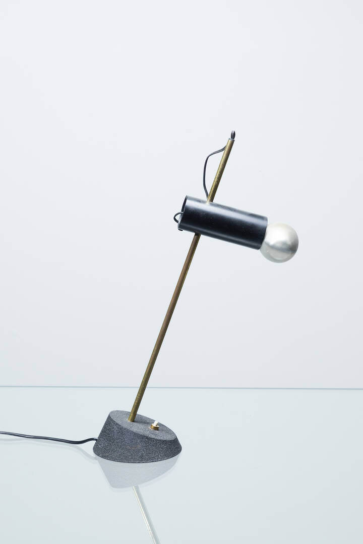 Stelo in ottone lungo il quale scorre il canotto portalampada in alluminio verniciato, base in ghisa
