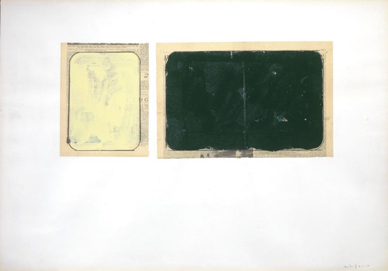 Mario Schifano Homs 1934 - Roma 1998 Senza titolo, 1967-1969 Tecnica mista su carta, cm. 70x100 Firma in basso a destra: Schifano. Al verso: etichetta M.S. Multistudio / Archivio dell'Opera Pittorica / di Mario Schifano, con n. 67-69/84. Certificato con foto Fondazione M.S. Multistudio, Milano, 23 luglio 2012, con n. 67-69/84.