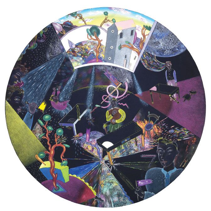 Luca Alinari Firenze 1943 Spaparanzatura classica di chi può tutto, 1995 Olio e acrilico su tela tesa su tavola, cm. 150 ø Firma in basso al centro: Alinari; al verso scritta: LA / 29/V: etichetta con dati dell'opera, n. arch. LA 29/V e indicazione Pubbl. su "Nuvole corrono" / edizioni Bandecchi & Vivaldi / marzo 1997.