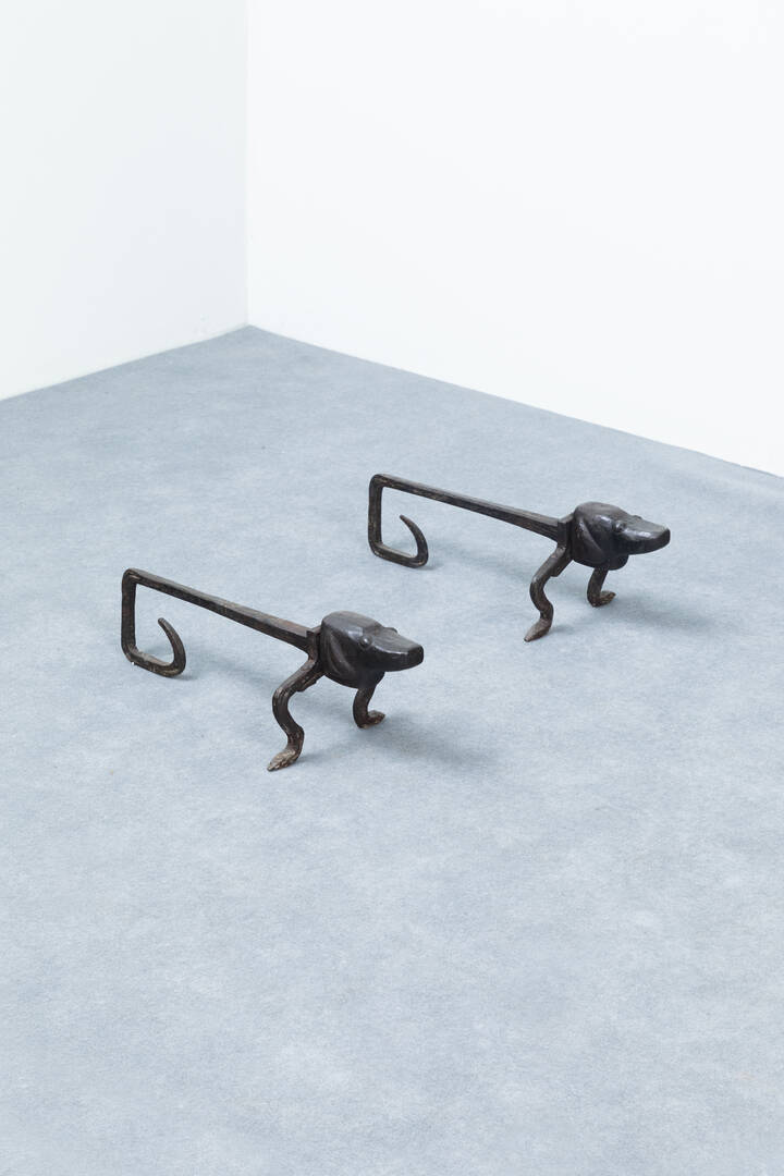 Coppia di alari in ferro patinato.