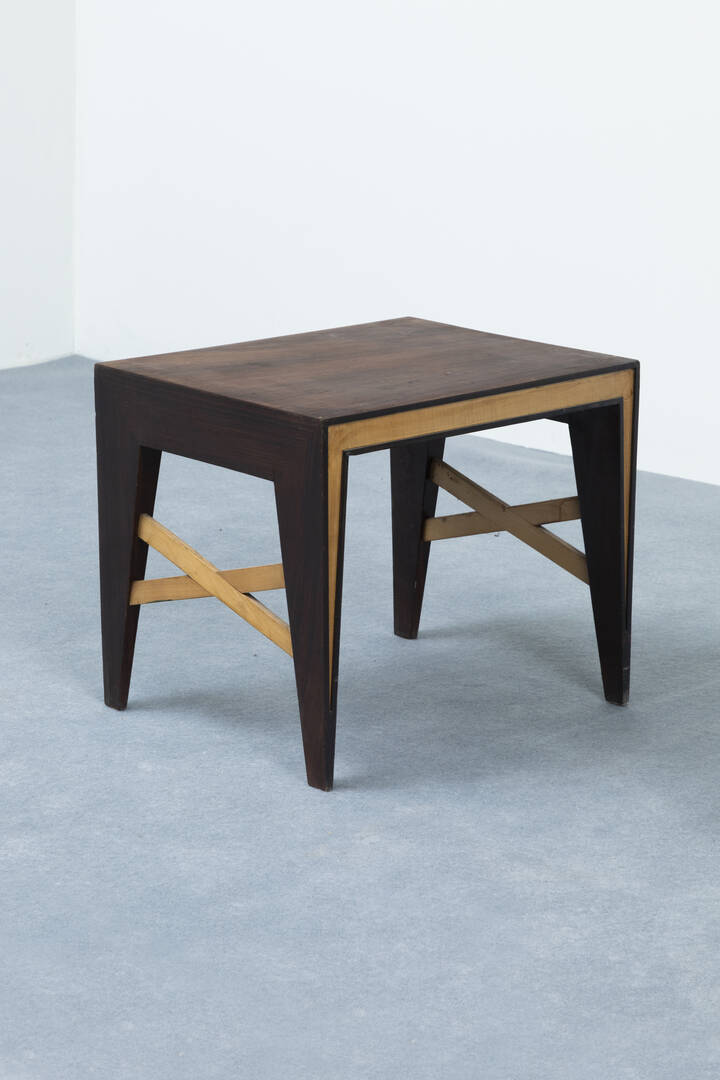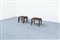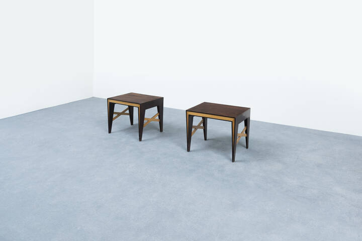 Coppia di tavolini in legni di varie essenze.