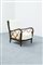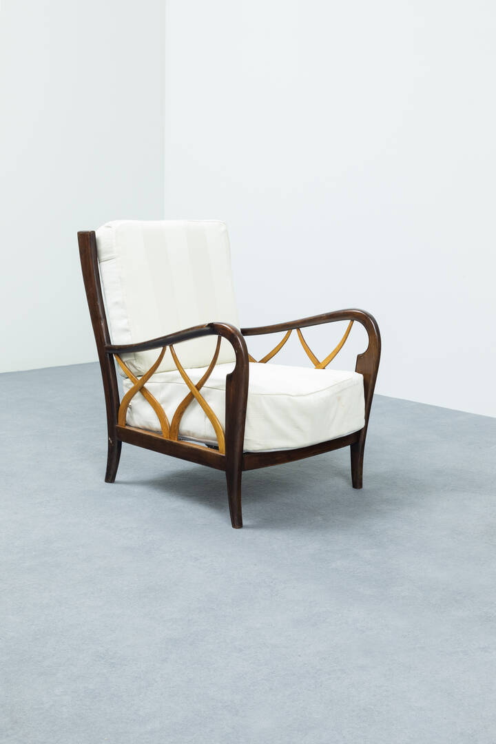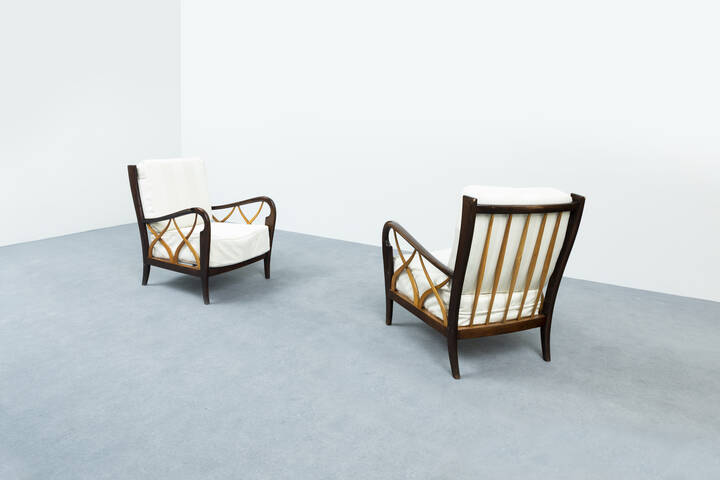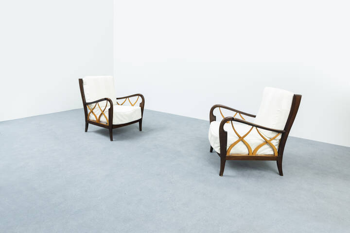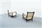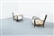 Coppia di poltrone con struttura in legno, cuscini imbottiti rivestiti in tessuto.