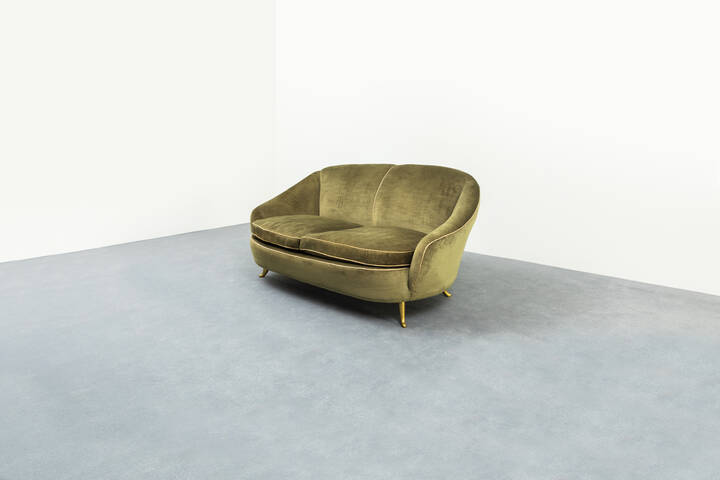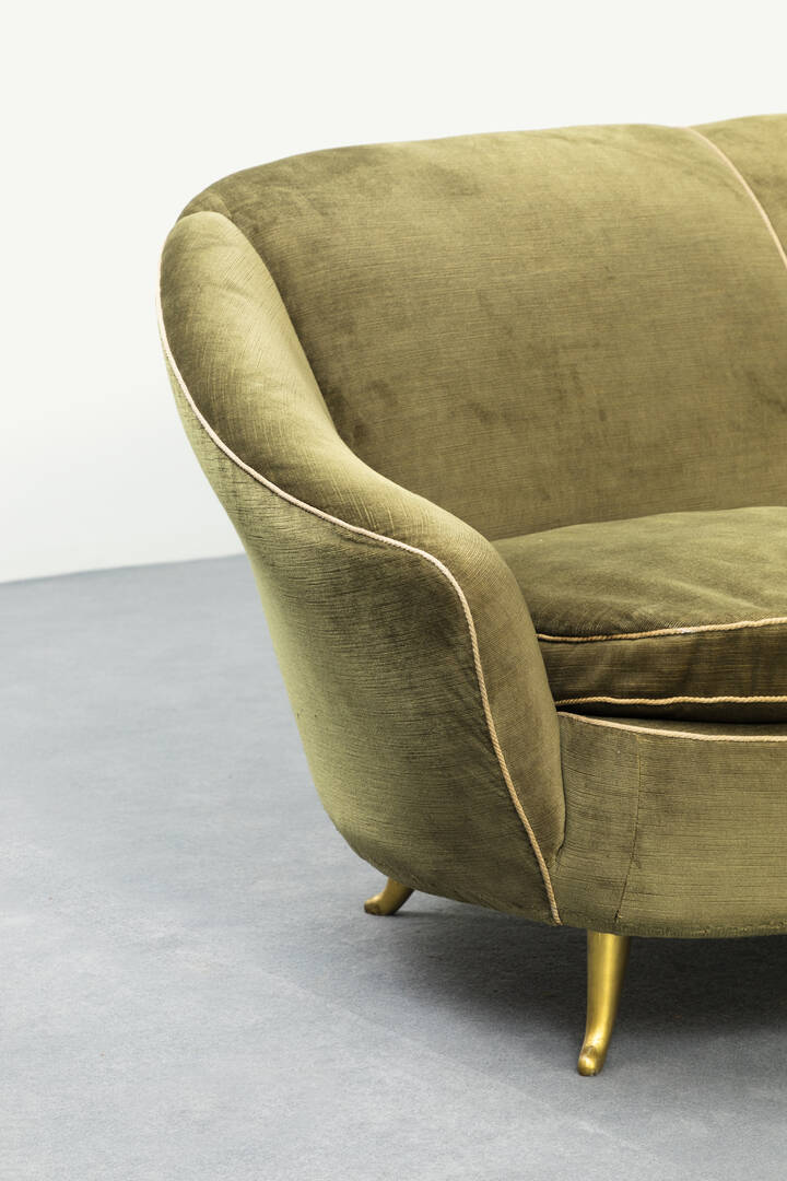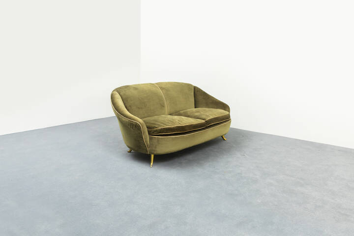 Divano con imbottitura rivestita in velluto, piedi in ottone.