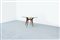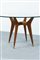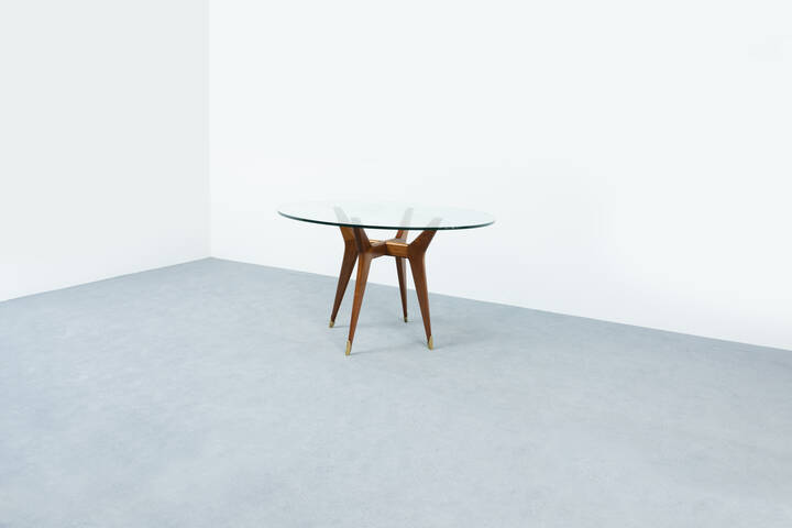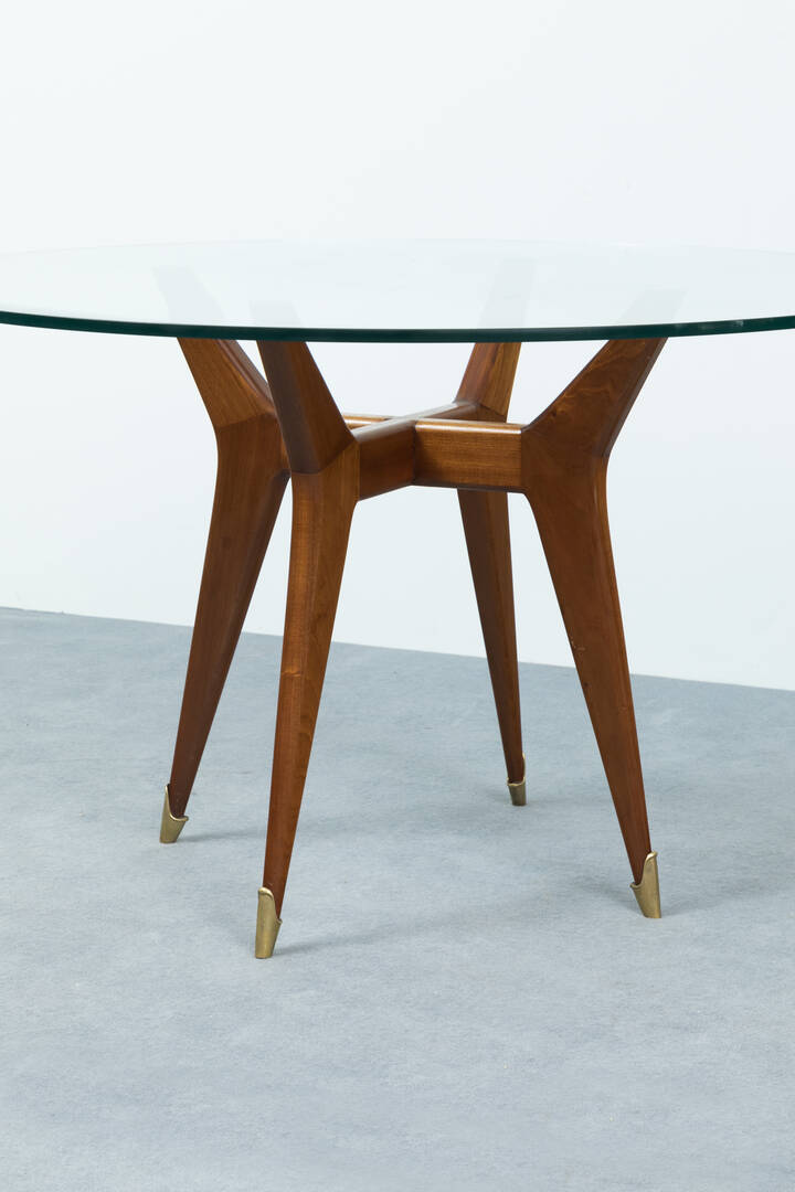 Tavolo con struttura in legno, piano in vetro di forte spessore e puntali in ottone