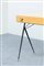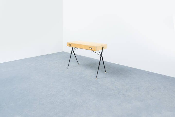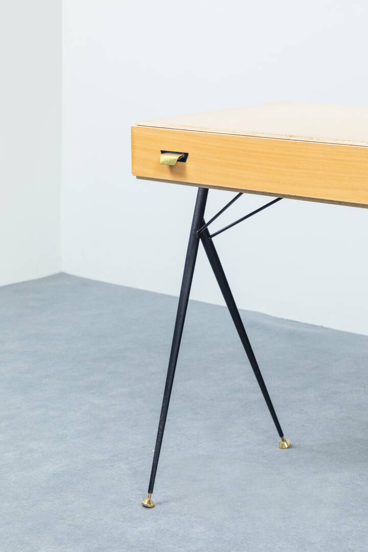 Scrivania con struttura in metallo laccato, cassetto e piano in legno, particolari in ottone.