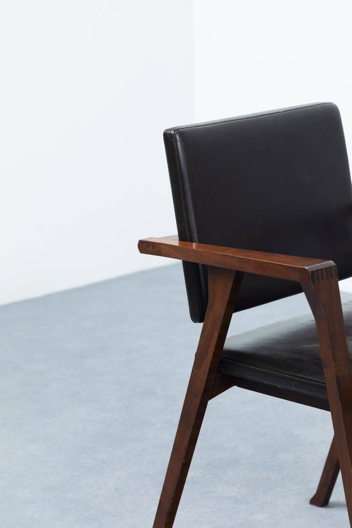 Struttura in legno di noce, sedile e schienale imbottiti in gommapiuma rivestita in pelle.