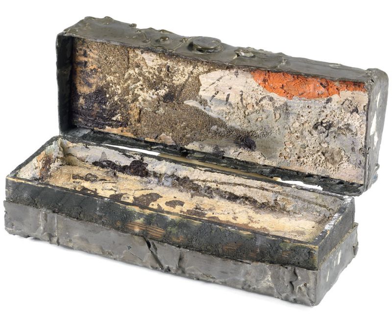 Gino Marotta e Gastone Novelli Campobasso 1935 - Roma 2012 / - Vienna 1925 - Milano 1968 Senza titolo, 1957 Piombo, legno e tecnica mista, cm. 8x25,5x9 Firme e data sotto la base: Gino Marotta / G. Novelli 57.