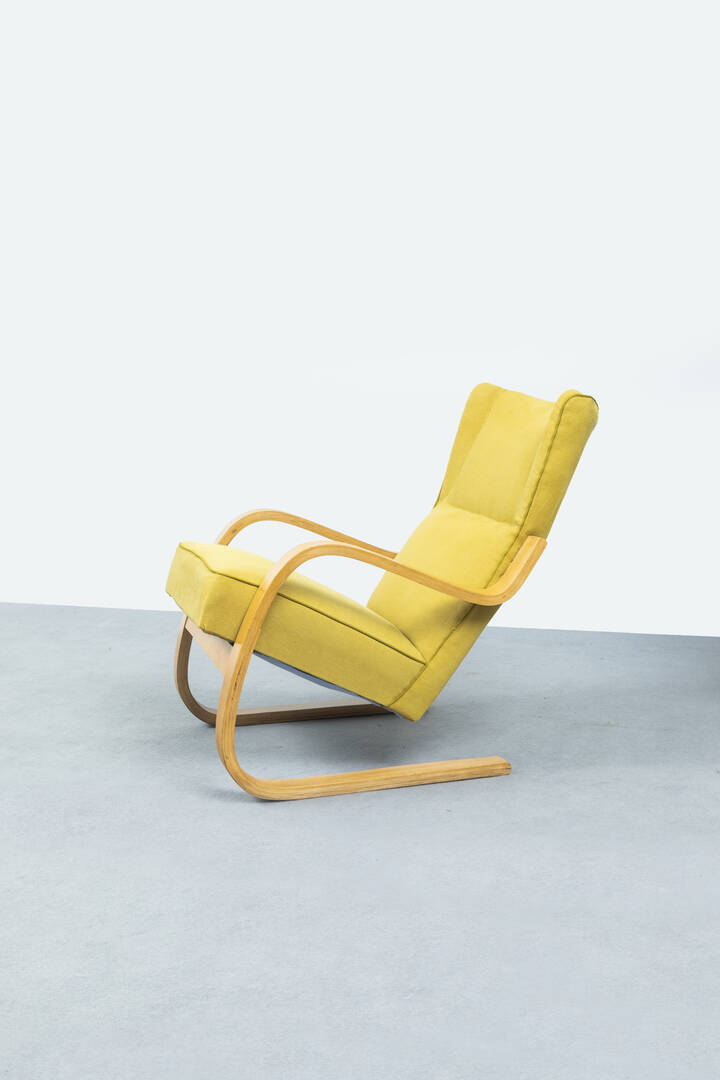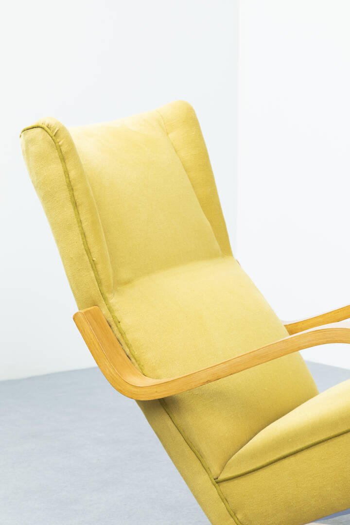 Coppia di poltrone con telaio in legno di betulla curvato, imbottitura rivestita in tessuto.