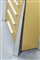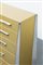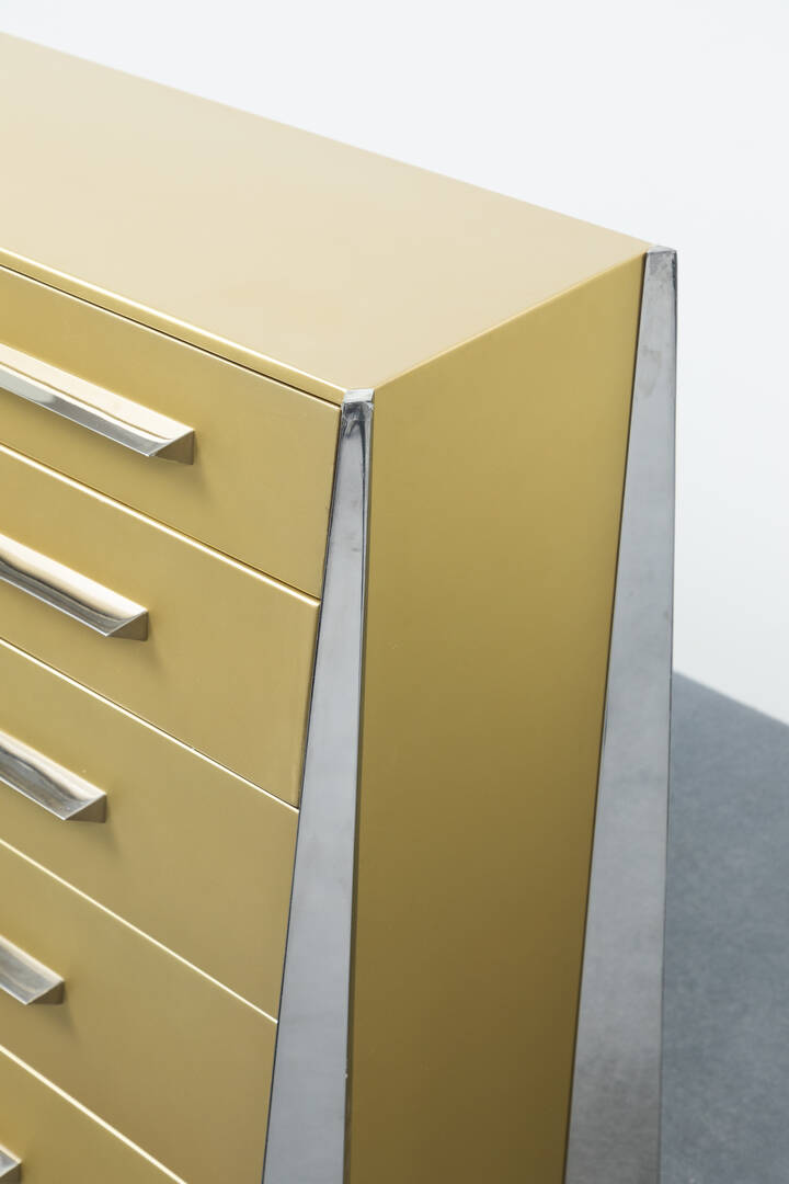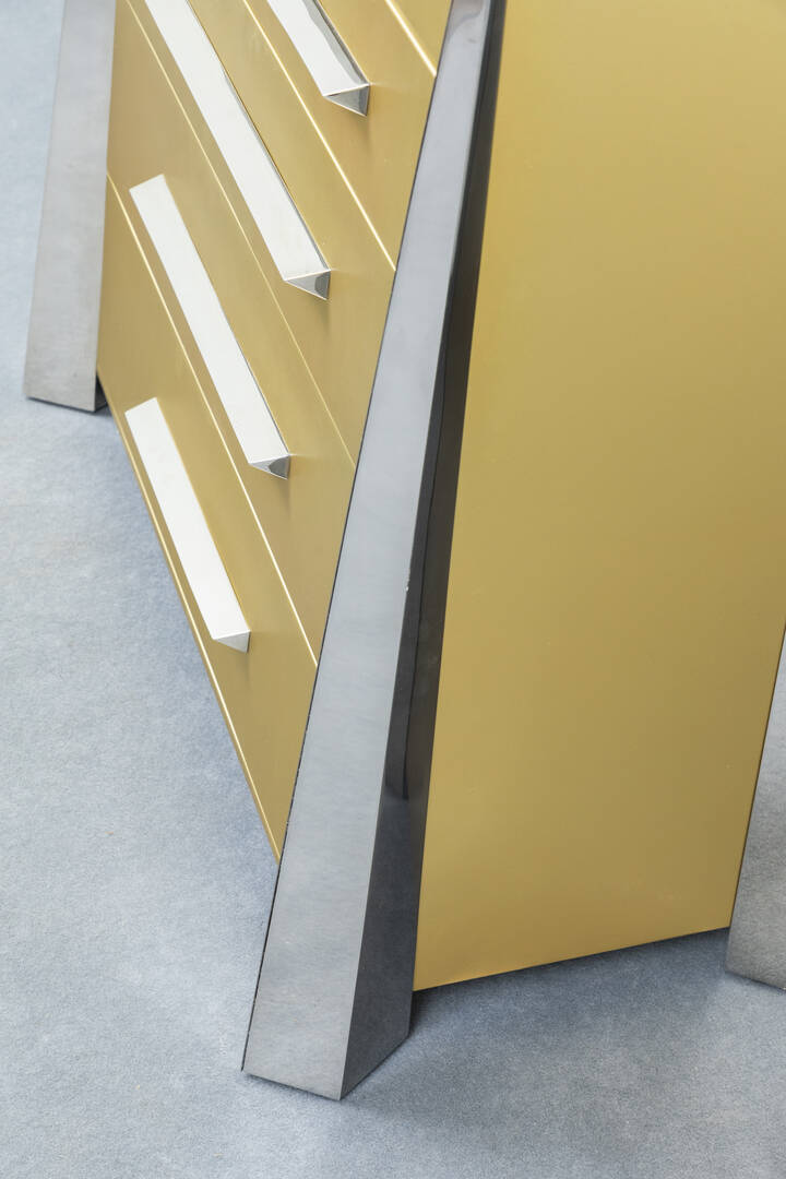 Cassettone a cinque cassetti, laccato oro, gambe e maniglie in acciaio.