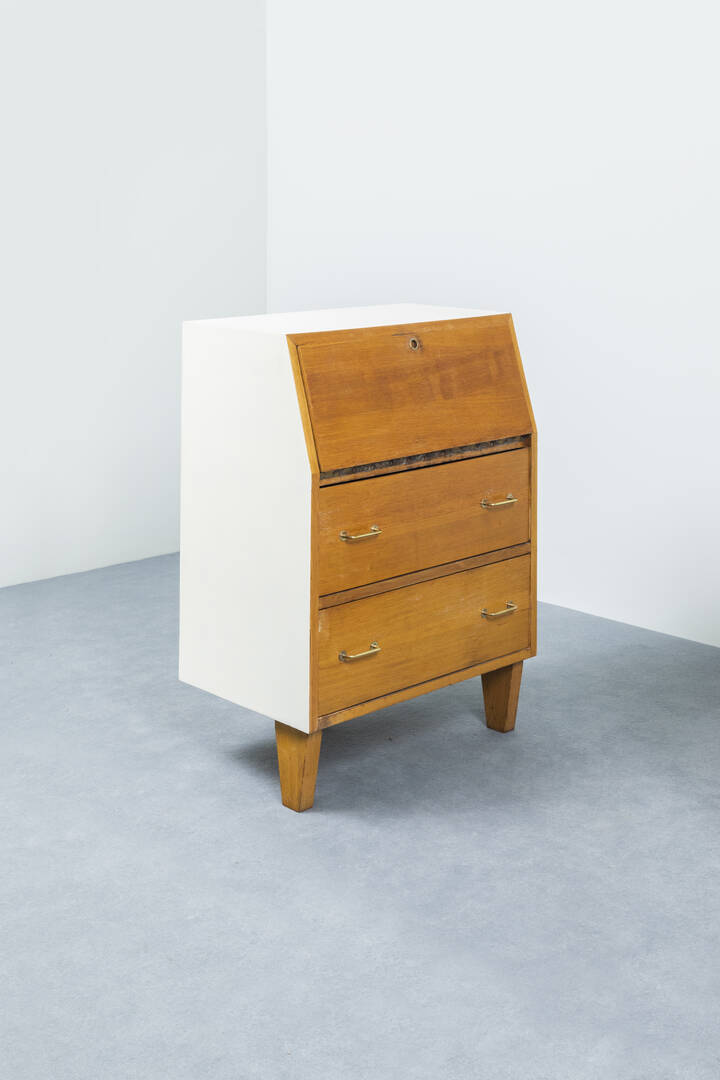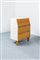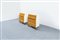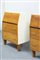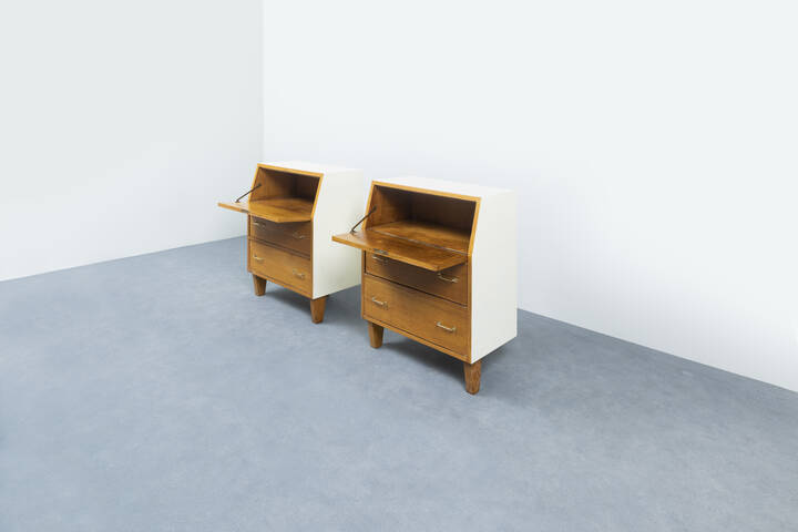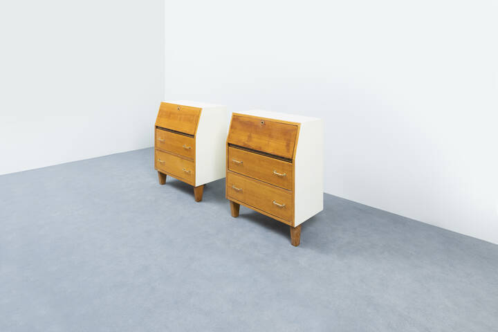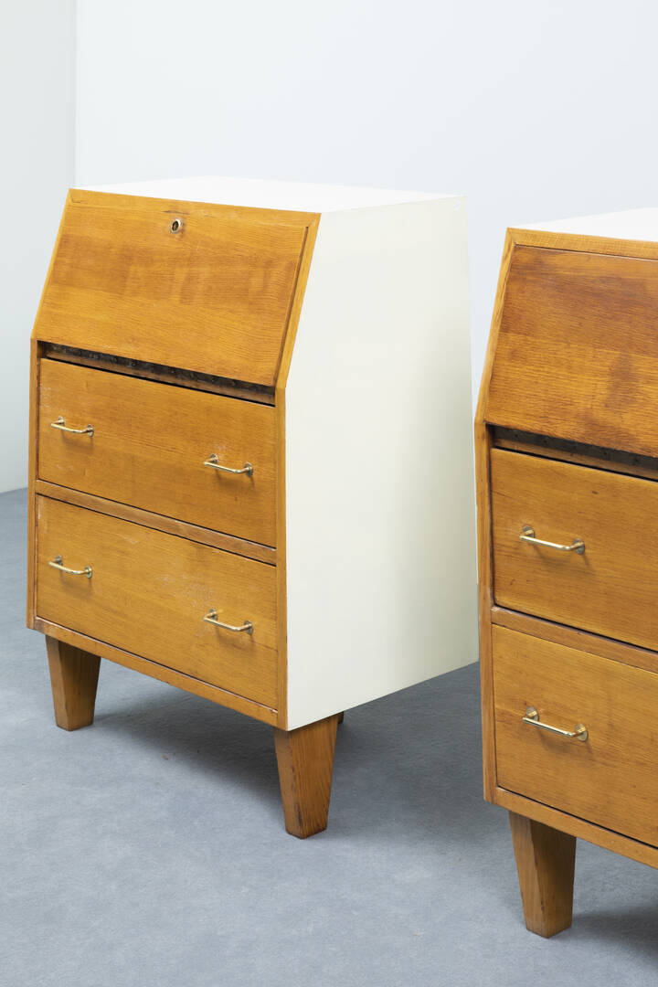 Coppia di mobili contenitori con antina a ribalta in legno naturale e legno verniciato.