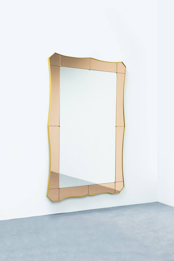 Specchiera con cornice in ottone e vetro colorato rosa.