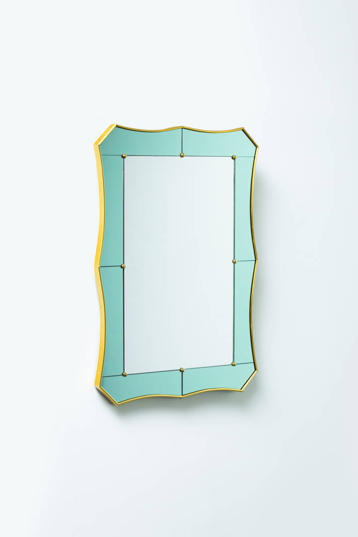 Specchiera con bordo in ottone, cristallo colorato e cristallo specchiato.