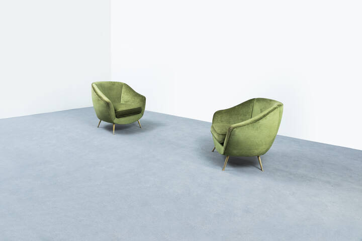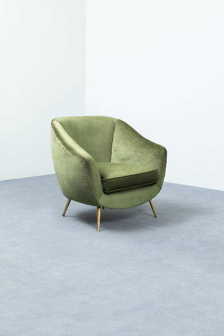 Coppia di poltrone con struttura in legno e rivestimenti in tessuto piedi in ottone.