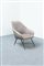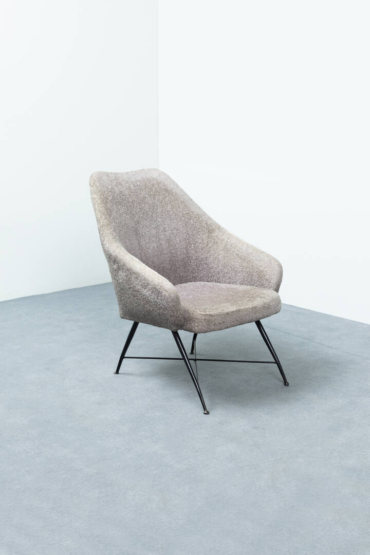 Poltrona con imbottitura rivestita in tessuto, gambe in metallo verniciato.