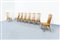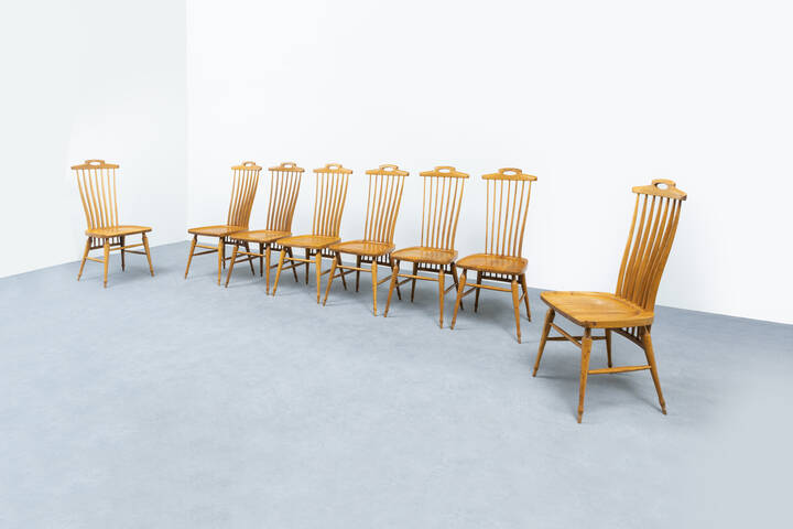 Otto sedie con struttura listellare in legno, gambe tornite.