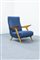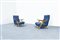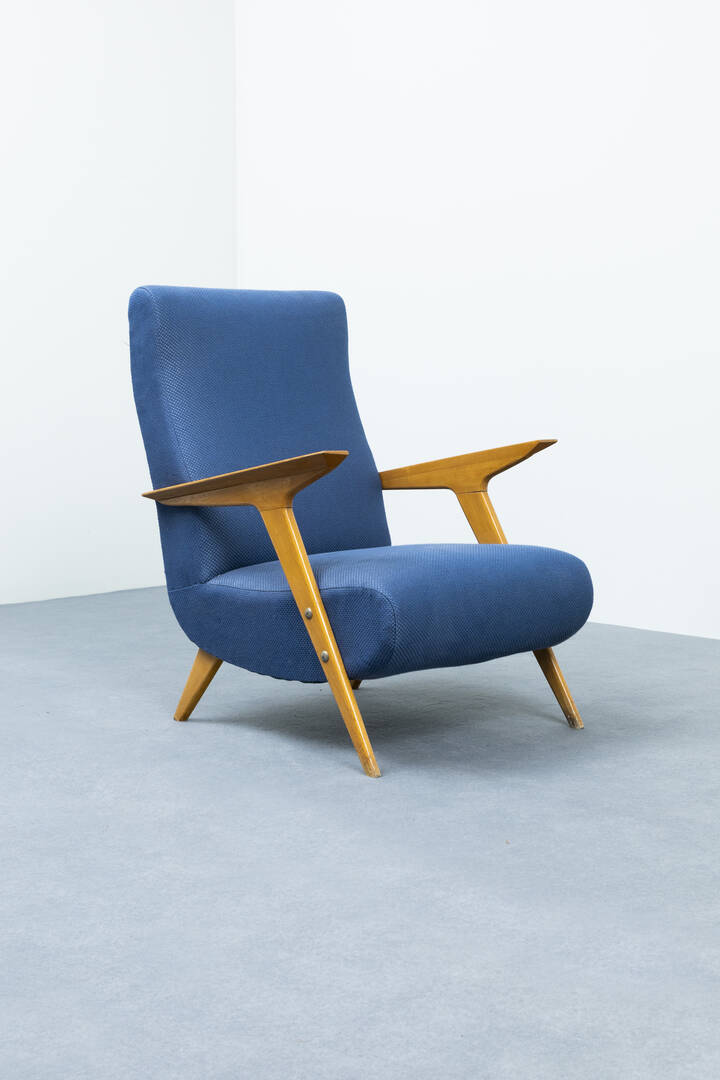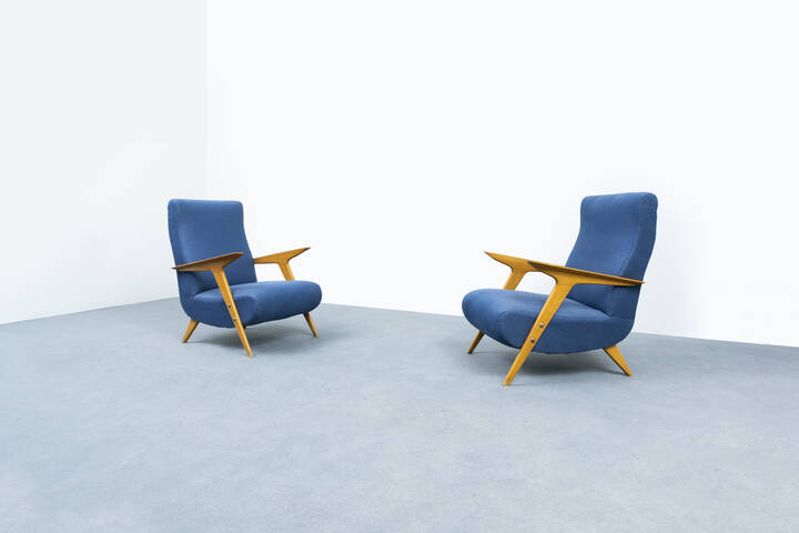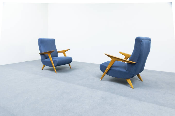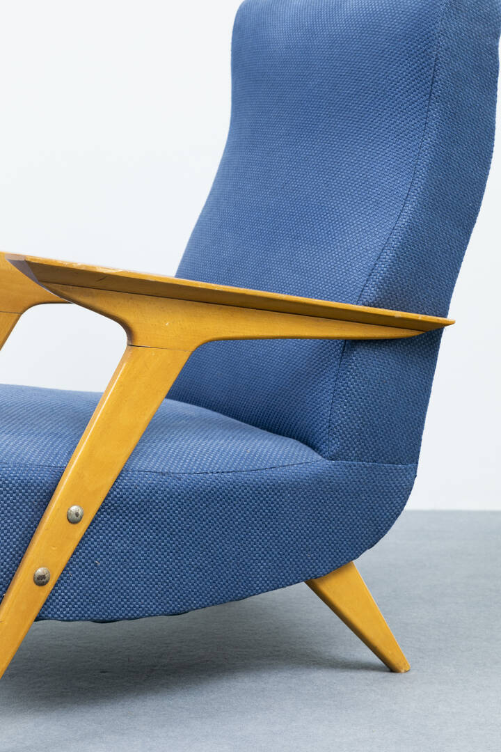 Coppia di poltrone in legno di faggio, imbottitura rivestita in canapa.