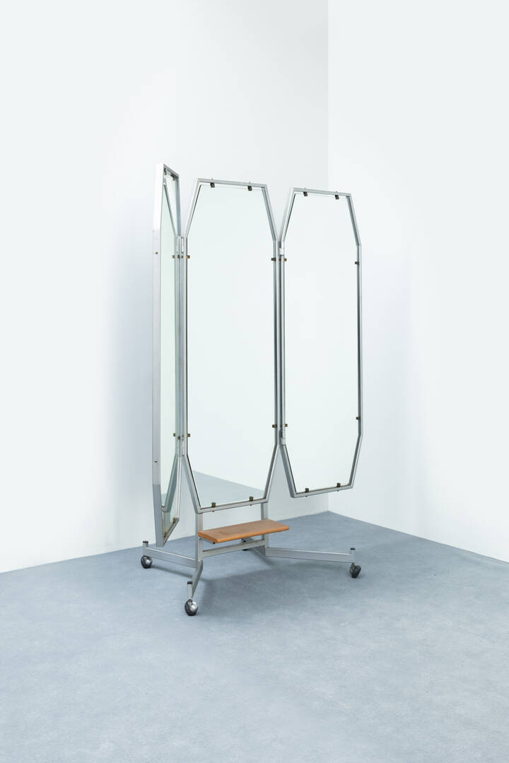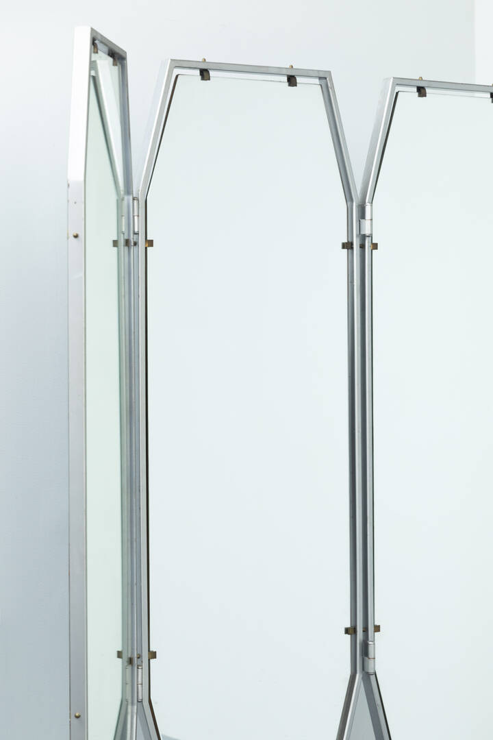 Specchiera composta da tre specchi, cornice e struttura in metallo.
