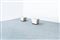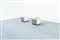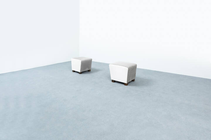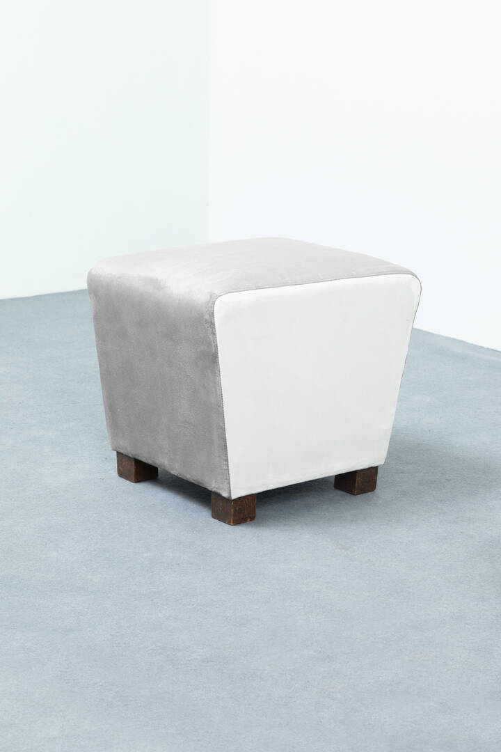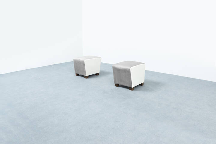 Coppia di sgabelli con imbottitura rivestita in tessuto, gambe in legno.