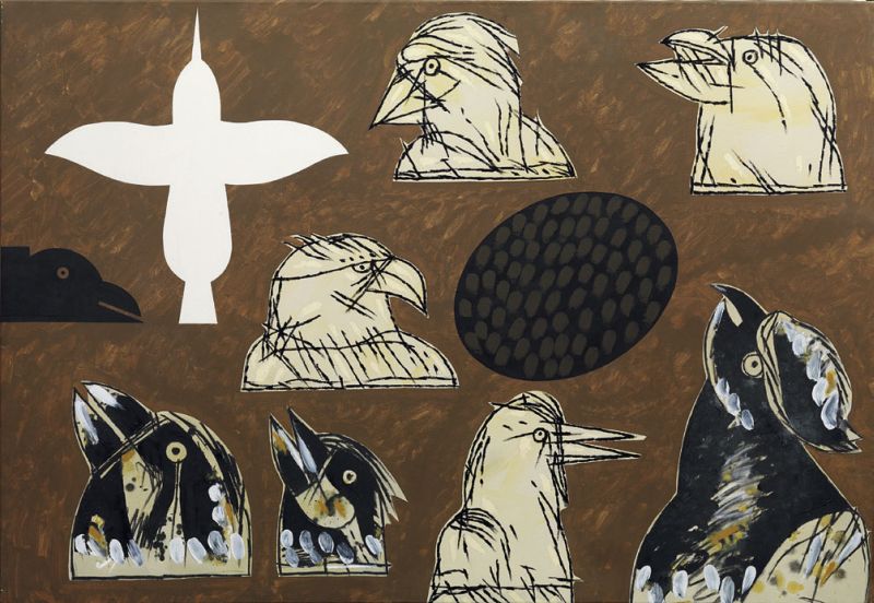 Concetto Pozzati Vò Vecchio (Pd) 1935 Sentinelle private dal volo, 1998 Olio e acrilico su tela, cm. 103x150 Firma e data al verso sulla tela: Pozzati 98; titolo sul telaio: "Sentinelle private dal volo". Foto autenticata dall'artista.