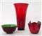 Lotto composto da un centrotavola in vetro incamiciato rosso e verde di Carlo Moretti, un vaso in vetro soffiato rosso firmato a punta sotto la base "Venini 97" e un vasetto a fazzoletto in vetro incamiciato rosso e verde dedicato e firmato a punta sotto la base "Venini 2006". Murano, produzione recente. (h max cm 27)
