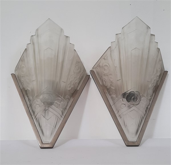 Coppia di lampade da parete Art Déco in vetro soffiato in stampo trasparente incolore acidato sulla superficie interna, struttura in ottone nichelato e acciaio aisi. Francia, secolo XX. (h cm 32) (lievi difetti e piccole modifiche)