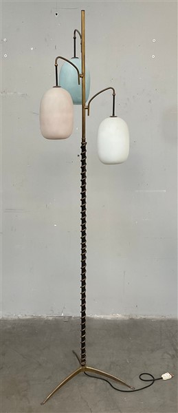 Lampada da terra a tre luci con fusto in metallo verniciato nero e ottone, paralumi in vetro incamiciato e acidato azzurro e lattimo. Italia, anni '50. (h cm 178) (lievi difetti)