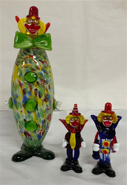 Lotto composto da tre sculture a tutto tondo in vetro e pasta vitrea policroma raffiguranti pagliacci. Secolo XX. (h max cm 43) (difetti)