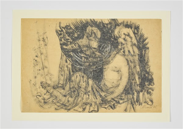 Italia, seconda metà secolo XX. Inchiostro nero di china su carta da spolvero. Incollato a foglio di carta. Firma a matita del collezionista al verso. (cm 25x37,4 - cm 29,7x42) (lievi difetti)